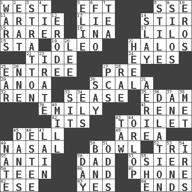 ACROSS 1. Compass direction 5. Lizard (obsolete) 8. Compass dir. 11. Nick name for Arthur 13. Untruth 14. Tumult 15. More uncommon 16. _ tizzy (2 wds.) 17. _ and Stitch 18. R.R. building 19. Butter sub 21. Radiant circles of light 22. Event that recurs at intervals 24. Sight organs 25. Main course 27. Before (prefix) 29. Small Philippine buffalo 30. Any of the three canals of the cochlea 32. Monthly bill 33. Gospel singer Marvin 35. Dutch treat 39. Poet Dickinson 41. French philosopher Descartes 42. It is 43. Rest room 45. Small valley 48. Length times width 49. Rhinal 50. Soup holder 52. Three (prefix) 55. Against 56. Male parent 57. Flexible twig of a willow tree 59. Adolescent 60. Also 61. Give a jingle 62. Compass dir. 63. Affirmative reply 64. Extremities DOWN 1. Armed conflicts 2. Part of Q.E.F. 3. Ski resort town in Vermont 4. Standoff 5. Writer Wiesel 6. A pale, very dry sherry 7. Afternoon social gathering 8. Vertical member of a panel or frame 9. Grain storage towers 10. Greek god of love 12. Eat (away) 14. Kill 20. Area sheltered from the wind 21. The bottom of a shoe or boot 23. Feeling or showing extreme anger 25. Ewer handle 26. Compass dir. 27. Personal Computers (abbr.) 28. Actress Charlotte 30. Declare 31. Nest on high 33. Be seated 34. Raised railways 36. Accusation by an informer 37. One (Scot) 38. Was introduced to 40. Place where flour is made 43. The 23rd letter of the Hebrew alphabet 44. Fourth or lowest deck 45. Natives or inhabitants of Denmark 46. First name in cosmetics 47. (Had) reclined 49. Nathan's nickname 50. Object of repulsion 51. Probability 53. Tear apart 54. Angers 56. 24 hours 58. A female animal or person