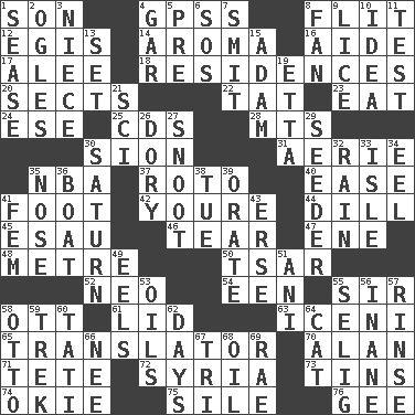 ACROSS 1. Male offspring 4. Global Positioning Systems (abbr.) 8. Secret move to avoid paying debts 12. The front part of a cuirass 14. Odor 16. Helper 17. Toward shelter 18. Homes 20. Religious groups 22. Make lace 23. Erode 24. Compass dir. 25. Music discs 28. Mountains (abbr.) 30. The Jewish people; Israel 31. Nest on high 35. Basketball assoc. 37. Printing process, for short 40. Relaxation 41. Lowest support of a structure 42. You are 44. Deli pickle 45. He sold his birthright 46. Rend 47. Compass dir. 48. Distance measurement (Brit.) 50. Russian ruler of old 52. Modern: prefix 54. Car or cant ending 55. Title for a knight 58. Baseball player Mel 61. Hat (slang) 63. Ancient Celtic tribe of eastern Britain 65. Interpreter 70. ____ Jay Lerner 71. Wig 72. Damascus' land 73. Airtight sealed metal containers 74. Migrant worker of the '30s 75. Drop; flow; fall 76. Unit of force equal to gravity DOWN 1. Gospel singer Marvin 2. Stares at amorously 3. Sibling's daughter 4. Slender fish 5. Before (prefix) 6. Mayday 7. Stricken, poetically 8. Avid follower 9. Louse (plural) 10. The content of cognition 11. Trial 13. Arrange properly for use 15. First of billions? 19. Singer James 21. _-fi 26. Dinghy 27. Snout, nose 29. Sowing specialist 30. Titan orbits this 32. Precipitation 33. Capri or Wight 34. Snakelike fish 35. Olfactory organ 36. Water vessel 38. Third day of the wk. 39. Declaim 41. Opposite of masc. 43. Celtic language 49. Snakelike fish 51. Cuckoo 53. Lubricates 55. Major League Baseball Commissioner Bud 56. Empty; void 57. Wash lightly 58. "Beetle Bailey" pooch 59. Long journey 60. Jacques of French films 62. 24-hour periods 64. Domesticated feline 66. Born 67. Three (prefix) 68. Lubricate 69. Actress Charlotte