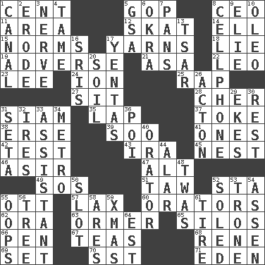 ACROSS 1. Penny 5. Grand Old Party 8. Corporate head (abbr.) 11. Length times width 12. Three-handed card game 14. Pipe bend 15. Typical standards 17. Tall tales 18. Whopper 19. Contrary to your interests or welfare 21. White ___ sheet 22. Lion 23. Area sheltered from the wind 24. Electrically charged atom 25. Hit sharply and swiftly 27. Be seated 28. "Mermaids" star 31. Thailand, formerly 35. Pet locale 37. Casino tip 38. Celtic language 39. "Barney Miller" actor Jack 41. Washington bills 42. Trial 43. Lyricist Gershwin 45. A home for chicks 46. SW Saudi Arabia district 47. The first octave above the treble staff 49. Distress signal 51. The 23rd letter of the Hebrew alphabet 52. R.R. building 55. Baseball player Mel 57. Not strict 60. Speakers 62. Mouth or opening 63. Channel Islands abalone 65. Grain storage towers 66. Writing instrument 67. Beverages made from leaves 68. French philosopher Descartes 69. Put into a specified state 70. Fast jet (abbr.) 71. Paradise DOWN 1. Lessep's creation 2. Wear away 3. Impudent aggressiveness 4. Not wild 5. Girls' org. (abbr.) 6. Gumbo ingredient 7. Zero-star reviews 8. Portable communications device 9. Writer Wiesel 10. Margarine 13. Russian ruler of old 16. Indian titles of respect 17. Gossips 20. Land 26. 13-14th century defensive garment 29. Supplements with great effort 30. State of inaction 31. Stalk of a moss capsule 32. Angers 33. Helper 34. Paris' subway 36. Luau course 40. Speaker 44. Having or resembling wings 48. It was, poetically 50. Notch 52. Having a sole or soles 53. Heavy duty weighing machine 54. NE Netherlands city 55. I made a mistake 56. Relationship diagram 58. Ancient Greek god of war 59. Dec. holiday 61. Hoop that covers a wheel 64. Eastern Standard Time (abbr.)