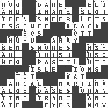ACROSS 1. Friend of Pooh 4. Have the gumption 8. Connecticut Ivy Leaguer 11. Plus 12. Empty; void 14. Notch 15. Adolescent 17. Contemptuous expression 18. Allows 19. Substance 21. Phillipine bananalike plant 23. Distress signal 24. Baseball player Mel 25. Chinese city south-southwest of Nanjing 27. Like ___ of sunshine 30. Benjamin's nick name 31. Sounds asleep 34. Overdraft (abbr.) 37. Nonscientific branch of learning 38. From or relating to Ireland 39. Bear (Spanish) 40. Modern: prefix 41. Soft color 43. Shoshoni 44. Capri or Wight 45. Charged atoms 47. Small child 49. Large container 50. Therefore, facetiously 52. Chrissie's court nemesis 56. _ vera 57. Fertile tracts in a desert 60. Northwest Algerian city 61. Prong on a fork 62. Buy and sell 63. One (Scot) 64. Had dinner 65. Snake ____ (dice throw) 66. Immediately DOWN 1. Pace 2. Singles 3. Lyric poems 4. Plates 5. Queen of England 1702-14 6. Actress Charlotte 7. Compass dir. 8. Voters do this 9. Globular water bottle used in Asia 10. ___ a Wonderful Life 13. Epoch 14. Narrow board 16. Soft 20. Good sense 22. Male child 25. Past tense of be (plural) 26. To (old English) 27. Ascend 28. Respite 29. American tennis player Robert 30. Prohibit 32. Cuts off 33. Of the mouth 34. Part of speech 35. Fast planes 36. Enemy 42. One who doesn't tell the truth 44. Call ___ day 46. Von Bismarck 47. Marketplace scale 48. Double curve, resembling the letter S 49. Flower holders 50. Came down and settled, as after flight 51. Car dealer's back yard 52. Ancient Persian 53. SW Asia republic 54. Billionth: prefix 55. Afresh 56. "One Day ___ Time" 58. "We ___ not amused" (Victoria) 59. Declare