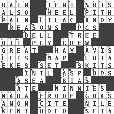 ACROSS 1. Precipitation 5. Portable shelter 9. Indian titles of respect 13. In addition 14. Person who is morally reprehensible 15. Heart or essence 16. Inside of hand 17. Pale purple color 18. "60 Minutes" Commentator Rooney 19. Thinks logically 21. Personal Computers (abbr.) 22. Small valley 23. Woody plant 24. Baseball player Mel 27. Travel a route regularly 28. Ship's personnel 29. Relatively large 31. Can I? 32. Advice 36. Allows 37. Atlas unit 38. Globular water bottle used in Asia 39. Supplements with great effort 40. Arrange properly for use 41. Burlesque acts 42. International (abbr.) 44. Viper 46. Two (Sp.) 47. At sea 48. Prejudice 50. Had dinner 51. Fools 54. Hindu Mythology: god of death 56. Eat (away) 58. Pate de foie ____ 60. At once, immediately (arch.) 61. Quote 62. Mediterranean tributary 63. Gone 64. Wrote a lyric poem 65. Stalk of a moss capsule DOWN 1. Hit sharply and swiftly 2. Having or resembling wings 3. Capri or Wight 4. Roamer 5. Without viscosity 6. Snakelike fish 7. Teachers' org. 8. Affectionate concern, for short 9. High altitude stroll 10. Remove soap 11. It would 12. Like a shrinking violet 17. Hang loosely or laxly 20. Back-to-school mo. 21. Before (prefix) 23. Attempt 24. Stare at amorously 25. Long journey 26. Wig 28. Head covering 30. Helper 31. Floor protector 33. Null 34. "Tell ____ the Marines!" 35. Backtalk 37. Cartoonist voice _ Blanc 40. R.R. building 41. Connect, as a bridge 43. Born 44. Tolerated 45. Trig term 47. Composer Copland 49. Public displays of written messages 51. Musical sound 52. 4th largest of the Great Lakes 53. Table seasoning 54. Opening into something insatiable 55. One (Scot) 56. Environmental prefix 57. To free from 59. Ocean