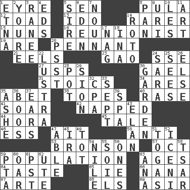 ACROSS 1. Jane of fiction 5. Elected rep. 8. Monetary unit of Botswana 12. Frog relative 13. Wedding promise 14. More uncommon 15. Religious women 16. One who advocates reunion 19. "We ___ not amused" (Victoria) 20. Pre-World Series prize 21. Snakelike fish 23. E Mali city 24. Compass dir. 27. United States Postal Service (abbr.) 30. Highlander 31. Unemotional ones 34. Ancient Greek god of war 35. Collude with 38. Drinks excessively 40. Raze (variant) 41. Fly high 42. Slept 44. Israeli folk dance 45. Falsehood 46. Curvy letter 47. Small island 50. Against 53. "Death Wish" actor 57. Sep. follower 59. Census information 63. Ripens 64. Clothes sense 65. Whopper 66. Nanny 67. Johnson of "Laugh-In" 68. Raised railways 69. SW Saudi Arabia district DOWN 1. Inactive volcano in Sicily 2. You are 3. Indian princess (variant) 4. Begley and Asner 5. Beget 6. Genesis locale 7. Part of speech 8. Baking dish 9. RI univ. 10. French article 11. Tate display 14. Printing process, for short 17. Tired old horse 18. _ tizzy (2 wds.) 20. Inconspicuous attention getter 22. A period of five years 24. "Two Mules for Sister ____" 25. Observes 26. Otherwise 28. Cooking vessel 29. The Jewish people; Israel 30. Place where plants grow 32. Accounting whiz (abbr.) 33. Back-to-school mo. 35. American tennis player Robert 36. Scornful sounds 37. Hearing organs 39. Health resort 43. Flair 47. Competent 48. Retirement account (abbr.) 49. Small child 51. Ancient Roman robes 52. Ancient Celtic tribe of eastern Britain 54. "Death on the ____" 55. Earth 56. Singles 58. Russian ruler of old 59. Parent Teacher Assoc. 60. Rowing implement 61. Pacific Standard Time (abbr.) 62. Shoshoni 63. Santa ___, CA