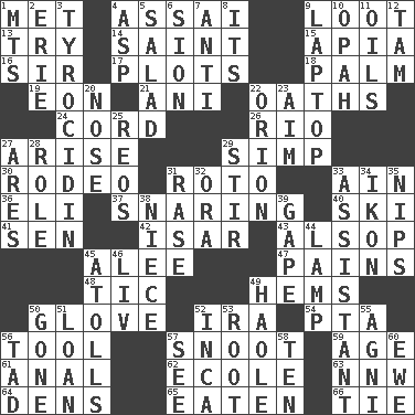 ACROSS 1. Was introduced to 4. Slender Brazilian palm 9. Spoils 13. Attempt 14. Inhabitant of Heaven 15. Capital of Western Samoa 16. Title for a knight 17. Small pieces of grounds 18. Inside of hand 19. Age 21. Black tropical American cuckoo 22. Expletives 24. Drawstring 26. _ de Janeiro 27. Originate 29. Simple or foolish person 30. Cowboy competition 31. Printing process, for short 33. The 18th letter of the Arabic alphabet 36. Connecticut Ivy Leaguer 37. Catching in a trap 40. What Jean-Claude Killy likes to do 41. Elected rep. 42. Austrian river, tributary to the Danube 43. Columnist Joseph or Stewart 45. Toward shelter 47. Aches 48. Nervous spasm 49. Equivocates 50. Michael Jackson trademark 52. Retirement account (abbr.) 54. Parent Teacher Association (abbr.) 56. Implement 57. Snob 59. Mature 61. Of or related to the anus 62. Learning spot: Fr. 63. Compass dir. 64. Hiding places for outlaws 65. Consumed 66. Neckwear DOWN 1. Mountains (abbr.) 2. 4th largest of the Great Lakes 3. Polypeptide antibiotic 4. Cleo's killer 5. Vegetable dish 6. The Jewish people; Israel 7. Opposed to 8. ___ a Wonderful Life 9. Portable computer 10. Brightly colored fish 11. Lubricates 12. Scottish cap 20. Sense of smell 22. Greek mythologigal hunter 23. Direct toward a target or goal 25. Vintage cars 27. Ancient Greek god of war 28. Hero or heavy, e.g. 29. Move through with a circular motion 31. Raze (variant) 32. Mouth or opening 33. Helper 34. Visual representation of an object 35. Pinches, bites 38. Sibling's daughter 39. Yawn 44. Desk light 45. Ringlike coral islands and reefs 46. 54 in ancient Rome 49. White Person, in Hawaii 50. Went 51. Grant temporary use of 52. South American Indian 53. Carrot, for example 55. Hindu god of fire 56. Small boy 57. Observe 58. Nine, plus one 60. She-sheep