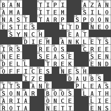 ACROSS 1. Forbid 4. Native american tent (variation) 8. Muslim summons to prayer 12. Housemaid (var.) 13. Detail 14. Grain storage tower 15. Political cartoonist Thomas 17. Canvas cover 18. Soup utensil 19. _____ Park, CO 21. It would 23. Modern: prefix 24. Synchronize (abbr.) 26. Consume 28. South Vietnam president (1954) 30. Short socks 34. Big collection agency 37. Vintage cars 39. Algonquian 40. Born 41. Gospel singer Marvin 43. Elected rep. 44. Small valley 46. Long journey 47. Conclusion 48. Positions of authority 51. Soft 54. Ending with capital 55. Applies to a surface 58. It is 61. A saturated hydrocarbon 63. Entreaties 65. Echolocation 67. Scornful sounds 71. Thin strip of wood or metal 72. Operatic vocal solo 73. At one time in the past 74. Untruth 75. Round or rotation of duties 76. Remaining after all deductions 77. Followers of ems DOWN 1. Object of repulsion 2. Collect or gather 3. Offensive 4. Teat (slang) 5. Call ___ day 6. For each 7. Body of Kaffir warriors 8. Viper 9. The Jewish people; Israel 10. Medicinal plant 11. Words to Nanette 16. Look after 18. Neighbor of Neb. 20. _-fi 22. "___ Little Indians" 25. Possessive pronoun 27. Affectionate concern, for short 29. Confronts 30. NE Netherlands city 31. Celtic language 32. Adolescent 33. Transmit 34. _ china 35. Coral ridge 36. Automatic 38. Boat paddle 42. Supplemented with great effort 45. Cards in a Roman deck? 49. Russian ruler of old 50. Car or cant ending 52. Plant excrement 53. Frame or body of a ship 56. Calif. Air Force Base 57. Smooth fabric 58. Austrian river, tributary to the Danube 59. "Corrida" creature 60. In a ____ (agitated or irritated) 62. Inky black, to poets 64. "______ My Girl" (Turtles hit) 66. American Automobile Association (abbr.) 68. Single 69. Sep. follower 70. Put into a specified state