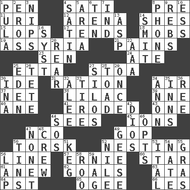 ACROSS 1. Writing instrument 4. Suttee (variant) 8. Before (prefix) 11. RI univ. 12. Sports stadium 14. "______ My Girl" (Turtles hit) 15. Chops off 17. Watches over 18. Disorderly crowds 19. Nineveh was its capital 21. Aches 23. Elected rep. 24. Had dinner 25. Singer James 27. Portico 30. Binary compound 31. Food allowance for one day 34. Wind 37. Fish or hair follower 38. Pale purple color 39. Compass dir. 40. One (Scot) 41. Worn away 43. Single 44. Perceives with the eye 45. Charged particles 47. Non-commissioned officer (abbr.) 49. Grand Old Party 50. Cod relative 52. Snuggling 56. Actor's bit 57. Bert's buddy 60. Play the lead 61. Afresh 62. Purposes of endeavors 63. _ moment's notice (2 wds.) 64. Pacific Standard Time (abbr.) 65. Double curve, resembling the letter S 66. French article DOWN 1. Monetary unit of Botswana 2. Greek god of love 3. Pinches, bites 4. Smooth fabric 5. Type of rug 6. Nine, plus one 7. Working for oneself (abbr.) 8. Give a jingle 9. Confederate soldiers (slang) 10. Curvy letter 13. Viper 14. Stricken, poetically 16. System (abbr.) 20. Buttocks 22. Auto club (abbr.) 25. Paradise 26. Wig 27. Grain storage towers 28. Frog relative 29. At one time in the past 30. _ tizzy (2 wds.) 32. Toward shelter 33. Hoop that covers a wheel 34. Soon (poet.) 35. Taverns 36. To riddle 42. "Vaya con ____" 44. Mayday 46. Chooses 47. Music written for nine 48. Group working together 49. Honkers 50. Metal containers 51. Cask 52. Mediterranean tributary 53. Slanted text style (abbr.) 54. Nathan's nickname 55. Pate de foie ____ 56. Pet locale 58. Friend of Pooh 59. Tired old horse