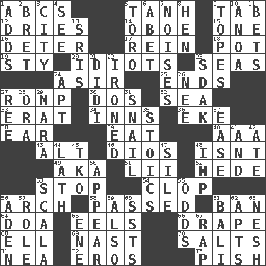 ACROSS 1. Lettered men learn these first 5. Hyperbolic tangent 9. Keyboard key 12. Frees from moisture 14. Mitch Miller's instrument 15. Single 16. Prevent from occurring 17. It's straight from the horse's mouth 18. Cooking vessel 19. Filthy place 20. Foolish or stupid persons 23. Oceans 24. SW Saudi Arabia district 25. Conclusions 27. Play 30. Two (Sp.) 32. Ocean 33. Part of Q.E.F. 34. Taverns 36. Supplement with great effort 38. Hearing organ 39. Ingest 40. American Automobile Association (abbr.) 43. The first octave above the treble staff 46. "Vaya con ____" 48. Is not 49. Alias (abbr.) 51. Cards in a Roman deck? 52. Ancient Persian 53. Halt 54. Hoof sound 56. Bowlike part 58. Went by 61. Prohibit 64. ___ good deed 65. Snakelike fish 66. Window treatment 68. Pipe bend 69. Political cartoonist Thomas 70. Table seasonings 71. Teachers' org. 72. Greek god of love 73. Expression of disdain DOWN 1. Does sums 2. Cy Young winner Saberhagen 3. Municipality 4. Observe 5. "Corrida" creature 6. Collude with 7. Annoying sounds 8. Layer 9. Drinks excessively 10. Small Philippine buffalo 11. Stakes 13. Indian titles of respect 21. "You Light Up My Life" star Conn 22. Pressed 23. Neighbor of Neb. 24. Fitting 26. Born 27. Portuguese money of account (variant) 28. Mouth or opening 29. Hindu Mythology: god of death 31. Slow-paced one 35. Unemotional ones 37. Relaxation 41. Added to 42. Had dinner 44. Thin strip of wood or metal 45. Ring climax 47. Drop; flow; fall 48. Naughty child 50. Become visible 53. Any of the three canals of the cochlea 55. Likelihood 56. Arabian gulf 57. Hero or heavy, e.g. 59. In addition 60. Fast planes 61. Indonesian resort city 62. Flats, for short 63. Soft 65. Compass dir. 67. Strike