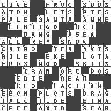 ACROSS 1. Moving, as bait 5. Toadlike animal 9. Beer foam 13. Tiny particle 14. Allows 15. Sliced desserts 16. Light colored 17. Before Barbara or Clara 18. Queen of England 1702-14 19. Small, flat, pigmented spot on the skin 21. Sep. follower 22. Mild oath, euphamism for damn 23. Toward the sea 24. 100% 27. Marina Del _, California 28. Frozen precipitation 29. Capital of Egypt 31. Afternoon social gathering 32. Opinion 36. Cause heat under the collar 37. Make supply last 38. Globular water bottle used in Asia 39. Greek god of love 40. Friend of Pooh 41. Burlesque acts 42. SW Asia republic 44. The grampus (Milton) 46. Two (Sp.) 47. Singer Brickell 48. Stern 50. Corporate head (abbr.) 51. Of or relating to Laos or its people 54. Inky black, to poets 56. Secret plans 58. To trail on the ground 60. Baby powder 61. Event that recurs at intervals 62. Inactive volcano in Sicily 63. Algonquian 64. Enthusiastic 65. Dry up DOWN 1. Infant locale 2. Slanted text style (abbr.) 3. Short-tailed, large-bodied rat 4. Make improvements or corrections to 5. Insipid 6. Former U.S. Attorney General Janet 7. Baseball player Mel 8. Girls' org. (abbr.) 9. High altitude stroll 10. National forest in Provo, Utah 11. Lair 12. Compass dir. 17. Trig term 20. Edible starchy tuberous root 21. Bear (Spanish) 23. Santa ___, CA 24. 1/640 square mile 25. Den 26. _ and Stitch 28. Observe 30. Home 31. Ring climax 33. Empty area or space 34. "Tell ____ the Marines!" 35. Backtalk 37. Period of immesurable duration 40. Actress Charlotte 41. Scram! 43. _ de Janeiro 44. Declaimed 45. Vintage cars 47. Learning spot: Fr. 49. Amusement-park features 51. Farming town in central California 52. Johnson of "Laugh-In" 53. Nanny 54. And so on (abbr.) 55. Soap unit 56. Parent Teacher Association (abbr.) 57. 54 in ancient Rome 59. Slender fish