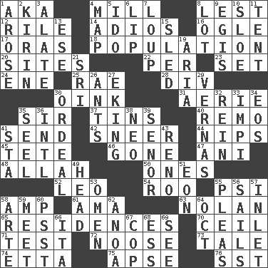 ACROSS 1. Alias (abbr.) 4. Place where flour is made 8. For fear that 12. Cause heat under the collar 14. Goodbye (Sp.) 16. Stare at amorously 17. Mouths or openings 18. Census information 20. Settings 22. For each 23. Arrange properly for use 24. Compass dir. 25. Actress Charlotte 28. HTML Container Element 30. Pig sound 31. Nest on high 35. Title for a knight 37. Airtight sealed metal containers 40. San ____ (Riviera town) 41. Transmit 42. Scornful expression 44. Cuts off 45. Wig 46. Went 47. Cuckoo 48. Assad's deity 50. Washington bills 52. Lion 54. Friend of Pooh 55. Air pressure measure (abbr.) 58. Electrical Unit 61. Nanny (var.) 63. Pitcher Ryan 65. Dwellings 70. To provide with a ceiling 71. Trial 72. Trap for birds or small mammals 73. Lie 74. Singer James 75. Domed church section 76. Fast jet (abbr.) DOWN 1. Came up 2. Japanese brewing company 3. Having winglike extensions 4. Atlas unit 5. Wedding promise 6. Mouth edge 7. Central Nebraska county 8. Car dealer's back yard 9. Armor plate that protects the chest 10. _ gin 11. Portable shelter 13. Compass dir. 15. Downhill vehicle 19. Operatic vocal solo 21. _ Lanka 26. Pismires 27. Supplementing with great effort 29. Actresses Bloom and Felton 30. Severe or trying experience 32. It's straight from the horse's mouth 33. Body of Kaffir warriors 34. Greek goddess of the dawn 35. Stitch closed the eyes of (a falcon) 36. International (abbr.) 38. Modern: prefix 39. Sir (Sp.) 41. R.R. building 43. Former U.S. Attorney General Janet 49. Froth on beer 51. Period of immesurable duration 53. Sign of things to come 55. Entreaties 56. Moves on water 57. An arm off of a larger body of water 58. Johnson of "Laugh-In" 59. Confront 60. Inconspicuous attention getter 62. Small Philippine buffalo 64. Sep. follower 66. Call ___ day 67. Police officer (slang) 68. Curvy letter 69. Observe