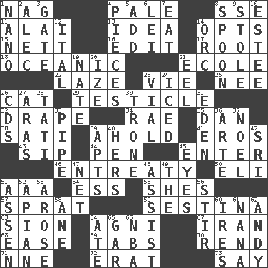 ACROSS 1. Tired old horse 4. Light colored 8. Compass dir. 11. Mountain range southwest of Kyrgyzstan 13. The content of cognition 14. Elects 15. Remaining after all deductions 16. Prepare for publication 17. Carrot, for example 18. Pertaining to the sea 21. Learning spot: Fr. 22. Goldbrick 23. Compete 25. Born 26. Feline 29. One of the two male reproductive glands 32. Window treatment 34. Actress Charlotte 35. One of the 12 tribes of Israel 38. Suttee (variant) 39. Hold, grip (Informal) 41. Greek god of love 43. Small drink 44. Writing instrument 45. Keyboard key 46. Plea 50. Biblical high priest 51. American Automobile Association (abbr.) 54. Double-curved letter 55. "______ My Girl" (Turtles hit) 57. Small fatty European fish 59. French poetic form 63. The Jewish people; Israel 64. Hindu god of fire 67. SW Asia republic 68. Relaxation 69. Bar bills 70. Tear apart 71. Compass dir. 72. Part of Q.E.F. 73. Declare DOWN 1. Billionth: prefix 2. Actor Baldwin 3. Yard entry 4. Components 5. Find the sum of 6. Luau accessory 7. Erode 8. Soup utensil 9. Took without asking 10. First name in cosmetics 12. Slanted text style (abbr.) 14. The grampus (Milton) 19. Nathan's nickname 20. Ending with capital 21. Snakelike fish 23. Small bottle 24. On the rocks 26. Music discs 27. Ancient river in northeast Turkey 28. Jacques of French films 30. Marketplace scale 31. Paradise 33. Corncob 36. Johnson of "Laugh-In" 37. Christmas carol 39. Flats, for short 40. Possessive pronoun 42. _ Lanka 45. Sight organs 47. Fish or hair follower 48. Help 49. Definite Article 51. NE Netherlands city 52. Bee-related 53. Came up 56. Tumult 58. One (Scot) 60. Angers 61. Grandmother 62. "60 Minutes" Commentator Rooney 64. Had dinner 65. Slender fish 66. Basketball assoc.