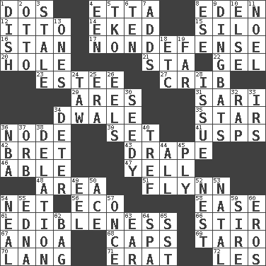 ACROSS 1. Two (Sp.) 4. Singer James 8. Locale of original sin 12. "Tell ____ the Marines!" 14. Made supply last 15. Grain storage tower 16. Comedian Laurel of Laurel & Hardy 17. Unrelated to defense, as in spending 20. Hollow 21. R.R. building 22. Set 23. First name in cosmetics 27. Baby bed with high sides 29. Ancient Greek god of war 31. Indian skirt 34. A sleeping potion; an opiate (poet.) 35. Play the lead 36. Thickened enlargement 39. Arrange properly for use 41. United States Postal Service (abbr.) 42. Cy Young winner Saberhagen 43. Window treatment 46. Competent 47. Shout 48. Length times width 51. Film actor Errol 54. Fish or hair follower 56. Environmental prefix 58. Relaxation 61. The property of being fit to eat 66. Disorderly outburst 67. Small Philippine buffalo 68. Smile enhancers 69. Edible starchy tuberous root 70. Austrian-born American filmmaker Fritz 71. Part of Q.E.F. 72. French article DOWN 1. Food container 2. "Beetle Bailey" pooch 3. Showing deterioration from age 4. Car or cant ending 5. Ring climax 6. "___ Little Indians" 7. Does sums 8. Compass dir. 9. Empty-headed or silly people 10. Otherwise 11. Christmas carol 13. Washington bills 18. And so on (abbr.) 19. Distant 24. The 23rd letter of the Hebrew alphabet 25. Epoch 26. Snakelike fish 28. Come out of 30. Full of seeds 32. Hit sharply and swiftly 33. Big collection agency 34. Prevent from occurring 36. Basketball assoc. 37. Globe 38. Conveyance 40. Unclean, religiously 44. 100% 45. Travel a route regularly 49. Snakelike fish 50. Adept person 52. Egg locale 53. Relating to or accompanying birth 54. Be tempered by heat 55. Pulitzer Prize-winning author Ferber 57. Single time 59. The founder of a family 60. Greek god of love 62. Container for groceries 63. Hearing organ 64. Health resort 65. Fast jet (abbr.)
