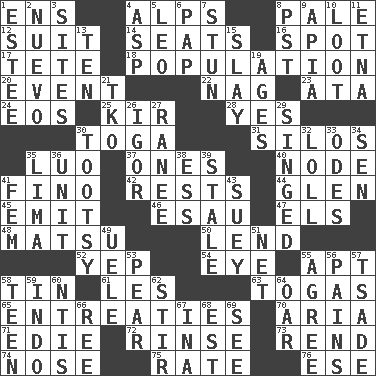 ACROSS 1. Followers of ems 4. High mountains 8. Light colored 12. Costume for a special activity 14. Theater features 16. Blemish 17. Wig 18. Census information 20. Incident 22. Tired old horse 23. "One Day ___ Time" 24. Greek goddess of the dawn 25. Apertif with cassis 28. Affirmative reply 30. Ancient Roman robe 31. Grain storage towers 35. Nilotic language 37. Washington bills 40. Thickened enlargement 41. Fine (Spanish) 42. Musical pauses 44. Small, secluded valley 45. Send forth 46. He sold his birthright 47. Raised railways 48. Taiwanese island in East China Sea 50. Grant temporary use of 52. Slangy assent 54. Sight organ 55. Fitting 58. Metal container 61. French article 63. Ancient Roman robes 65. Pleas 70. Operatic vocal solo 71. Singer Brickell 72. Wash lightly 73. Tear apart 74. Olfactory organ 75. Pace 76. Compass dir. DOWN 1. First name in cosmetics 2. New (sp.) 3. Settings 4. Viper 5. Lion 6. Infant food 7. Astound 8. Pacific Standard Time (abbr.) 9. Capital of Western Samoa 10. Plunder 11. Inactive volcano in Sicily 13. "___ Little Indians" 15. Kill 19. Ripens 21. Ring climax 26. Russian composer Stravinsky 27. Indian princess (variant) 29. Burned superficially 30. A girl or young woman (variant) 32. Hang loosely or laxly 33. Lyric poems 34. Elected rep. 35. Pale green bean 36. A single undivided whole 38. Double-curved letter 39. Lacking originality or spontaneity 41. Opposite of masc. 43. Chop _ 49. Ubangi River tributary 51. Fish or hair follower 53. Lightbulb-shaped fruit 55. Match 56. Aches 57. Sadhe (variant) 58. Adolescent 59. Southeast Asian peninsula 60. Nuclear Threat Initiatives 62. Use a swizzle stick 64. Rowing implement 66. To separate or throw off 67. _ tizzy (2 wds.) 68. Eastern Standard Time (abbr.) 69. Observe