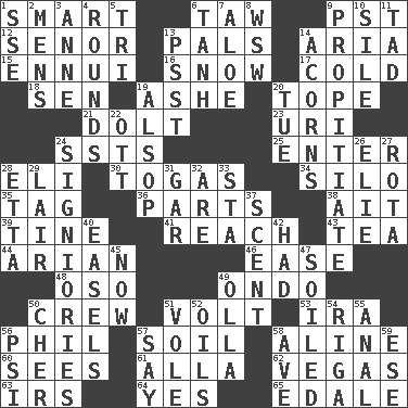 ACROSS 1. Don Adams' spy role 6. The 23rd letter of the Hebrew alphabet 9. Pacific Standard Time (abbr.) 12. Sir (Sp.) 13. Friends 14. Roberta Peters solo 15. World-weariness 16. Overwhelm 17. Chilled 18. Elected rep. 19. American tennis player Robert 20. Drink excessively 21. Stupid person 23. RI univ. 24. Fast planes 25. Keyboard key 28. Connecticut Ivy Leaguer 30. Ancient Roman robes 34. Grain storage tower 35. Label 36. Actors' quests 38. Small island 39. Prong on a fork 41. Arrive at 43. Beverage made from leaves 44. Believer in; advocate of (suffix) 46. Relaxation 48. Bear (Spanish) 49. Southwest Nigerian state 50. Ship's personnel 51. Electrical Unit 53. Lyricist Gershwin 56. Silvers or Donahue 57. Earth 58. Place in a line 60. Perceives with the eye 61. Silent film actress Nazimova 62. Viva Las _ 63. Big collection agency 64. Affirmative reply 65. Peak District village in England DOWN 1. Compass dir. 2. Not women's 3. Singer Murray 4. Periods in a boxing match 5. Three (prefix) 6. Hyperbolic tangent 7. _ vera 8. Compass dir. 9. Appease 10. Filth; sediment 11. Bit 13. Inconspicuous attention getter 14. Oak nuts 19. Columnist Joseph or Stewart 20. Third day of the wk. 22. Baseball player Mel 24. Seigniories (variant) 26. Writer Wiesel 27. Round or rotation of duties 28. Singer James 29. Den 31. Slender fish 32. "We ___ not amused" (Victoria) 33. R.R. building 37. Aroma 40. Artist's stands 42. Possessed 45. Immediately 47. Dirtied 49. Spanish pot 50. "Mermaids" star 51. Short-tailed, large-bodied rat 52. Petroleums 54. Port city in Latvia 55. Of or related to the anus 56. 23rd letter of the Greek alphabet 57. Declare 58. "___ Maria" 59. Compass dir.