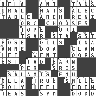 ACROSS 1. Actor Lugosi 5. Black tropical American cuckoo 8. Bits 12. Mountain range 13. Floor coverings 15. Actor Baldwin 16. Eating place 18. Bowlike part 19. Painter Guido (1575-1642) 20. The grampus (Milton) 22. Opts 24. Drink excessively 26. RI univ. 27. Russian ruler of old 28. R.R. building 29. Fast jet (abbr.) 32. Introduce or present, as a question 35. Petroleums 37. _ tizzy (2 wds.) 38. Queen of England 1702-14 39. ___ good deed 40. Dollar (slang) 41. Luau accessory 42. Gone 43. I made a mistake 44. Eastern Standard Time (abbr.) 45. Bit 46. Merit 49. For each 50. Indian titles of respect 51. Deli grouping 55. Australian flightless bird 56. Water jar 57. Loyal 59. Grin 63. Many (prefix) 64. Person who is morally reprehensible 65. Locale of original sin 66. Afternoon social gatherings 67. Symbol (abbr.) 68. Texas town _ City DOWN 1. Yet 2. Epoch 3. Experiment locale 4. One to whom something is allotted 5. Nursemaid (var.) 6. Drug cop 7. Hankering 8. Tarsus (plural) 9. Toward shelter 10. Cub Scout units 11. _-fi 14. Yells 17. Greek god of love 21. Numbers guy (abbr.) 23. Mouth or opening 25. Worn away 28. Chalkboards 29. Grain storage tower 30. Fastener 31. Scottish caps 32. Light colored 33. Singles 34. In a ____ (agitated or irritated) 36. Electrically charged atom 40. Eaten 42. Heat 45. Beverage made from leaves 47. "We ___ not amused" (Victoria) 48. Basketball hoops 49. Live dramatic performances 51. A type of plum 52. Silent film actress Nazimova 53. Angers 54. Chop _ 56. Choose 58. Shade tree 60. Wedding promise 61. Directed 62. Conclusion