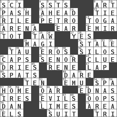 ACROSS 1. _-fi 4. Fast planes 8. Tate display 11. Romantic infatuation 13. Having the leading position 15. Neckwear 16. Cause heat under the collar 17. Stone: prefix 18. Ancient Roman robe 19. Sports stadium 21. Ewer handle 22. Independent ruler or chieftain 23. Small child 24. The 23rd letter of the Hebrew alphabet 27. Affirmative reply 29. Wise men 30. Lacking originality or spontaneity 34. The 19th letter of the Greek alphabet 36. Greek god of love 39. Grain storage towers 40. Smile enhancers 41. Sir (Sp.) 43. A slight indication 44. Frees from moisture 46. French philosopher Descartes 47. Pet locale 48. Arguments over trivial matters 49. Have the gumption 51. Nine, plus one 53. Australian flightless bird 54. Health resort 57. Residence 60. Rowing implement 63. Ferber et al. 65. Angers 66. Vices 69. I made a mistake 70. Daniel's nick name 71. Citrus fruits 72. Type of rug 73. Raised railways 74. Set or collection 75. Three (prefix) DOWN 1. Small fatty European fish 2. Capital of Egypt 3. Small island 4. Plant excrement 5. A female animal or person 6. False hair 7. "Two Mules for Sister ____" 8. Tiny particle 9. Swiss mountan, "Queen of the Mountains" 10. Pull into pieces 12. Layer 14. Small, narrow, flatbottom fishing boat 18. A testis 20. _ moment's notice (2 wds.) 25. Matures 26. One who wires 28. Curvy letter 29. French bagpipes 31. Silent film actress Nazimova 32. Central Nebraska county 33. Compass dir. 34. Canvas cover 35. Capital of Western Samoa 37. Single 38. Something which is sent 40. Music discs 42. 480, 500 or 516 sheets of paper 45. Compass dir. 50. Regret 52. Christmas carol 54. Derisive sound 55. Some stationery 56. Slender Brazilian palm 57. Flintstone garb 58. Relating to the mouth 59. Not women's 61. Opinion 62. Tall New Zealand timber tree 64. ___ good deed 67. Flowery wreath 68. Fast jet (abbr.)