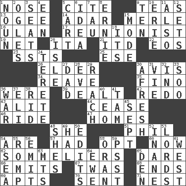 ACROSS 1. Olfactory organ 5. Quote 9. Afternoon social gatherings 13. Double curve, resembling the letter S 14. The sixth month of the Jewish calendar 15. Haggard of country music 16. Uhlan (variant) 17. One who advocates reunion 19. Fish or hair follower 20. Call ___ day 21. It would 22. Greek goddess of the dawn 23. Fast planes 25. Compass dir. 26. A person who is older than you are 30. Deliberation 34. Break or tear apart 35. Fine (Spanish) 36. We are 39. Started a card game 42. Do over again 43. Came down and settled, as after flight 44. Desist 46. Travel on or in a vehicle 47. Dwellings 48. A female animal or person 51. Silvers or Donahue 54. "We ___ not amused" (Victoria) 57. Possessed 58. Choose 60. At this time 62. Wine waiters 65. Have the gumption 66. Gives off 67. It was, poetically 68. Extremities 69. Tenement units (abbr.) 70. Emitted 71. A home for chicks DOWN 1. Part of speech 2. Stares 3. Theater features 4. Car or cant ending 5. Draw slowly or heavily 6. The content of cognition 7. The 19th letter of the Greek alphabet 8. Bert's buddy 9. Nine, plus one 10. 4th largest of the Great Lakes 11. In addition 12. Arranges properly for use 15. Method 18. ___ a Wonderful Life 20. Small island 24. Cigar-shaped 27. June honoree 28. First lady 29. Arrive at 30. Anew 31. Compete 32. Indiana (abbr.) 33. "Barney Miller" actor Jack 36. Armed conflict 37. Biblical high priest 38. To free from 40. Lion 41. Scottish cap 45. Back-to-school mo. 48. "______ My Girl" (Turtles hit) 49. Actor Linden 50. Prepares for publication 52. Empty; void 53. Titled peers of a realm 54. Toward the sea 55. Play 56. Send forth 58. Northwest Algerian city 59. Inconspicuous attention getter 61. Compass direction 63. Mountains (abbr.) 64. She-sheep 65. Lair