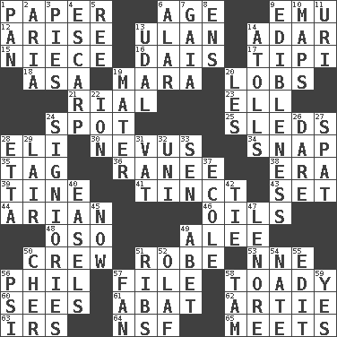 ACROSS 1. Some stationery 6. Grow older 9. Australian flightless bird 12. Ascend 13. Uhlan (variant) 14. The sixth month of the Jewish calendar 15. Sibling's daughter 16. Raised platform 17. Native american tent (variation) 18. White ___ sheet 19. Hindu Mythology: god of death 20. Tennis shots 21. Monetary unit of Yemen 23. Pipe bend 24. Specific locale 25. Bobsleighs 28. Biblical high priest 30. Mole, birthmark 34. Fastener 35. Label 36. Indian princess (variant) 38. Period 39. Prong on a fork 41. Colored lightly or faintly 43. Arrange properly for use 44. Believer in; advocate of (suffix) 46. Lubricates 48. Bear (Spanish) 49. Toward shelter 50. Group working together 51. Loose flowing garment 53. Compass dir. 56. Silvers or Donahue 57. Do some clerical work 58. Sycophant 60. Perceives with the eye 61. Blind as ____ 62. Nick name for Arthur 63. Big collection agency 64. Science/research agcy. 65. Confronts DOWN 1. Baking dish 2. Roberta Peters solo 3. Sliced desserts 4. Fortification 5. To separate or throw off 6. Having or resembling wings 7. Greek goddess of the earth (variant) 8. Followers of ems 9. The property of being fit to eat 10. Atlas contents 11. RI univ. 13. Allodial 14. Ringlike coral islands and reefs 19. Mother 20. French article 22. Electrically charged atom 24. Seigniories (variant) 26. Have the gumption 27. Petty quarrel 28. Singer James 29. Den 31. Large container 32. University (slang) 33. Elected rep. 37. Learning spot: Fr. 40. Artist's stands 42. Neckwear 45. At this time 47. Poe poem 49. Collude with 50. "Mermaids" star 51. Teases 52. Norwegian king 54. Nathan's nickname 55. Prepare for publication 56. Air pressure measure (abbr.) 57. Avid follower 58. Scottish cap 59. It is so