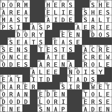 ACROSS 1. Dormintory (informal) 5. Possessive pronoun 9. A female animal or person 12. Length times width 13. Writer Wiesel 14. "______ My Girl" (Turtles hit) 15. Vertical spar for supporting sails 16. Assistant 17. Table seasoning 18. Air pressure measure (abbr.) 19. Cleo's killer 21. Nest on high 22. Small, narrow, flatbottom fishing boat 24. Car or cant ending 26. Two (Sp.) 27. Theater features 28. Relaxation 29. Elected reps. 30. Trials 32. Land measure 36. Single time 37. Had dinner 38. Group working together 39. Lyric poems 40. Sports stadium 42. Hero or heavy, e.g. 43. Toward shelter 44. Annoyingly loud 46. Consume 49. It would 50. Bits 51. Less widely known 53. Title for a knight 54. Soggy 57. NW Algerian seaport 58. Genesis locale 61. Lacquered or enameled metalware 62. Texas town _ City 63. Australian parrot (variant) 64. Celtic language 65. Compass dir. 66. Fastener 67. An important port of Yemen DOWN 1. Moist 2. Mouths or openings 3. Home 4. Floor protector 5. Pile 6. Biblical high priest 7. To free from 8. Perceive with the eye 9. Pottery fragment 10. Sun: prefix 11. _____ Park, CO 14. Compass dir. 19. Tate display 20. System (abbr.) 21. One (Scot) 23. Fertile tracts in a desert 24. Eroded 25. Curvy letter 27. Post 28. First name in cosmetics 29. "Barney Miller" actor Jack 31. Having ears or earlike features 32. Sour-tasting 33. What you're doing now 34. Trust 35. She-sheep 40. Keyboard modifier key 41. Opposed to 43. Atmosphere 45. Rowing implement 46. Wear away 47. Composer Copland 48. Exchange 52. Conclusion 53. Clip 55. Otherwise 56. Adolescent 58. Raised railways 59. Spanish title 60. Period 61. Afternoon social gathering