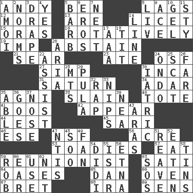 ACROSS 1. Actor Griffith 5. Benjamin's nick name 8. Straggles 12. Greater amount 13. "We ___ not amused" (Victoria) 14. It is permitted: Lat. 15. Mouths or openings 16. Happening in regular succession 19. Mischievous child 20. Choose not to consume 21. Shrivel 23. Had dinner 24. Order of Saint Francis (abbr.) 27. Simple or foolish person 30. South American Indian 31. Titan orbits this 34. The sixth month of the Jewish calendar 35. Hindu god of fire 38. Killed 40. Carry 41. Expressions of contempt or scorn 42. Seem 44. For fear that 45. Indian skirt 46. Compass dir. 47. Overdraft (abbr.) 50. 43,560 square feet 53. Sycophants 57. Erode 59. One who advocates reunion 63. Suttee (variant) 64. Fertile tracts in a desert 65. Daniel's nick name 66. Baking chamber 67. Cy Young winner Saberhagen 68. Lyricist Gershwin 69. Elected reps. DOWN 1. Mine, in Marseilles 2. Typical standards 3. Window treatment 4. Consenting reply 5. Sharp remark 6. Greek god of love 7. Remaining after all deductions 8. 54 in ancient Rome 9. Adept person 10. Set 11. Filthy place 14. Actor's bit 17. Auto club (abbr.) 18. Teat (slang) 20. Roberta Peters solo 22. Help 24. Southwest Nigerian state 25. Jazz singing style 26. Conductor's collection 28. Mountains (abbr.) 29. Monetary unit of Botswana 30. Of or pertaining to medicine 32. Hit sharply and swiftly 33. Cuts off 35. Competent 36. Leaves 37. Sense of smell 39. Teachers' org. 43. Ancient river in northeast Turkey 47. Nuclear Threat Initiatives 48. "Barney Miller" actor Jack 49. Avid follower 51. Break or tear apart 52. Consumed 54. "You Light Up My Life" star Conn 55. Austrian river, tributary to the Danube 56. Inactive volcano in Sicily 58. Metal containers 59. Director Reiner 60. Ewer handle 61. Purpose 62. Fish or hair follower 63. Mayday