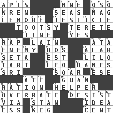 ACROSS 1. Flats, for short 5. Compass dir. 8. Bear (Spanish) 11. Songbird 12. Oceans 13. Tired old horse 14. Poe poem 17. A testis 19. Tootsie (variant) 21. Cigar-shaped 22. Prong on a fork 23. Consenting reply 24. Strike 27. (Had) reclined 29. "One Day ___ Time" 32. Foe 34. Two (Sp.) 36. Having or resembling wings 37. Stalk of a moss capsule 38. Eastern Standard Time (abbr.) 39. _ and Stitch 40. Small pie 41. Lion 42. Natives or inhabitants of Denmark 43. Indian title of respect (Mr.) 44. Fly high 46. Compass dir. 47. Had dinner 50. Island territory of the United States 52. Food allowance for one day 55. Aide 57. Make much ado about nothing 59. Cease 62. By way of 63. Comedian Laurel of Laurel & Hardy 64. The content of cognition 65. Double-curved letter 66. Barrel 67. Penny DOWN 1. Leather borer 2. Before (prefix) 3. Portable shelter 4. Snob 5. Born 6. Difficult 7. First name in cosmetics 8. At one time in the past 9. Table seasoning 10. Double curve, resembling the letter S 12. Filthy place 15. Agitated, as a liquid 16. Inactive volcano in Sicily 18. Big collection agency 20. A glass for beer 24. Musical pauses 25. Approach 26. _ dish (used to culture cells) 28. Olfactory organs 29. Place in a line 30. Stories 31. Came up 33. Floor covering 35. Moe Howard, for one 36. In the manner of 42. Window treatment 45. Old (Scot.) 47. Wind 48. Cod relative 49. Related on the mother's side 51. Mesonic 52. Be footloose 53. Opinion 54. Afternoon social gatherings 55. Layer 56. Travel on an animal 58. Label 60. Elected rep. 61. Make lace