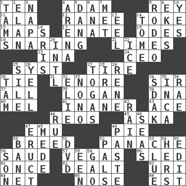 ACROSS 1. "___ Little Indians" 4. First of billions? 8. Marina Del _, California 11. Insect wing 12. Indian princess (variant) 14. Puff or smoke 15. Atlas contents 17. Maternal 18. Lyric poems 19. Catching in a trap 21. Citrus fruits 23. _ tizzy (2 wds.) 24. Corporate head (abbr.) 25. System (abbr.) 27. Hoop that covers a wheel 30. Neckwear 31. Poe poem 34. Title for a knight 37. 100% 38. Utah city north of Ogden 39. Heredity factor (abbr.) 40. Cartoonist voice _ Blanc 41. Sillier 43. Adept person 44. Vintage cars 45. "____ silly question..." 47. Australian flightless bird 49. Sliced dessert 50. A special lineage 52. Flamboyance 56. Saudi Arabian king (1953-1964) 57. Viva Las _ 60. Downhill vehicle 61. At one time in the past 62. Started a card game 63. RI univ. 64. Fish or hair follower 65. Olfactory organ 66. Eastern Standard Time (abbr.) DOWN 1. Scottish caps 2. Liveliness 3. California wine valley 4. Sports stadium 5. Mild oath, euphamism for damn 6. Santa ___, CA 7. Was introduced to 8. Cowboy competition 9. Makes supply last 10. Affirmative reply 13. Snakelike fish 14. Heavy book 16. Indian titles of respect 20. International (abbr.) 22. Frozen water 25. Filth; sediment 26. Shout 27. Ancient Roman robes 28. SW Asia republic 29. French philosopher Descartes 30. Scottish cap 32. Writer Wiesel 33. Words to Nanette 34. Neighbor of Neb. 35. South American Indian 36. Actress Charlotte 42. Water falling in drops from the sky 44. Sorrow 46. Oceans 47. Spew [out] 48. Ancient Persian 49. Thick mixture 50. Object of repulsion 51. Movie disc 52. Friends 53. A slight indication 54. Possessive pronoun 55. Prepare for publication 56. Manchild 58. Car or cant ending 59. E Mali city