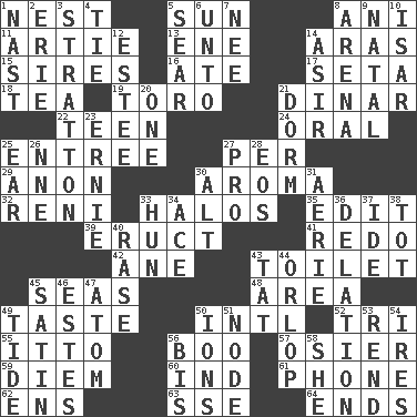 ACROSS 1. Egg locale 5. Player for Phoenix 8. Black tropical American cuckoo 11. Nick name for Arthur 13. Compass dir. 14. Ancient river in northeast Turkey 15. Founders of families 16. Had dinner 17. Stalk of a moss capsule 18. Beverage made from leaves 19. "Corrida" creature 21. Middle Eastern gold or silver currency 22. Adolescent 24. Taken by mouth 25. Main course 27. For each 29. At once, immediately (arch.) 30. Odor 32. Painter Guido (1575-1642) 33. Rings 35. Prepare for publication 39. Spew [out] 41. Redecorate 42. One (Scot) 43. Bathroom plumbing fixture 45. Oceans 48. Length times width 49. Clothes sense 50. International (abbr.) 52. Three (prefix) 55. "Tell ____ the Marines!" 56. Oct. 31 cry 57. Flexible twig of a willow tree 59. South Vietnam president (1954) 60. Indiana (abbr.) 61. Give a jingle 62. Followers of ems 63. Compass dir. 64. Extremities DOWN 1. Political cartoonist Thomas 2. One of the Great Lakes 3. Ski resort town in Vermont 4. Standoff 5. Burn superficially 6. To (old English) 7. Born 8. Sports stadium 9. Brizilian seaport 10. Austrian river, tributary to the Danube 12. First name in cosmetics 14. SW Saudi Arabia district 20. Single 21. Dormintory (informal) 23. Bert's buddy 25. Hearing organ 26. Compass dir. 27. Adept person 28. Greek goddess of the dawn 30. Keyboard modifier key 31. Nest on high 33. Attila the _ 34. Adept person 36. Conveyance 37. Binary compound 38. Small child 40. Raze (variant) 43. Make lace 44. Lowest deck of a ship 45. Smooth fabric 46. _____ Park, CO 47. Smallest unit of an element 49. Event that recurs at intervals 50. Charged atoms 51. Thickened enlargement 53. Tear apart 54. Angers 56. Twice 58. A female animal or person