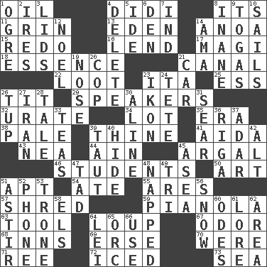 ACROSS 1. Petroleum 4. "You Light Up My Life" star Conn 8. It is 11. Broad smile 13. Genesis locale 14. Small Philippine buffalo 15. Do over again 16. Grant temporary use of 17. Wise men 18. Gist 21. Lessep's creation 22. Plunder 23. Call ___ day 25. Double-curved letter 26. Teat (slang) 29. Orators 32. A salt of uric acid 34. Car dealer's back yard 35. Period 38. Light colored 39. One or ones belonging to thee 41. Opera by Verdi 43. Teachers' org. 44. The 18th letter of the Arabic alphabet 45. Therefore, facetiously 46. SAT takers 50. Nonscientific branch of learning 51. Fitting 54. Had dinner 55. Ancient Greek god of war 57. Fragment 59. Player piano 63. Instrument 64. Central Nebraska county 67. Aroma 68. Taverns 69. Celtic language 70. We are 71. To riddle 72. On the rocks 73. Ocean DOWN 1. Legendary monster 2. Angers 3. Flaplike coverings 4. Keyboard key 5. Binary compound 6. Lair 7. Working for oneself (abbr.) 8. Silly 9. Ancient Roman robes 10. Travel by water 12. Christmas carol 14. Nursemaid (var.) 19. Characteristic smell of wine 20. Police officer (slang) 21. Auto 23. Image 24. False hair 26. Uncastrated adult male sheep 27. SW Asia republic 28. Lie 30. Place in a line 31. Burn superficially 33. Beverages made from leaves 36. Capital of Latvia 37. The sixth month of the Jewish calendar 39. Strained 40. Flintstone garb 42. The first octave above the treble staff 45. At sea 47. Small amount or degree 48. Slept 49. Three (prefix) 51. Being in motion 52. Give a jingle 53. Heavy duty weighing machine 56. Overwhelm 58. Raised railways 60. Lyric poems 61. Old wives' tales, e.g. 62. Type of rug 64. Luau accessory 65. The grampus (Milton) 66. Purpose