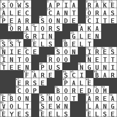 ACROSS 1. Sty mamas 5. Capital of Western Samoa 9. Libertine 13. Actor Baldwin 14. Patter 15. Mouths or openings 16. Lightbulb-shaped fruit 17. Message 18. Quote 19. Speakers 21. Alias (abbr.) 22. Amused look 23. Small, secluded valley 24. Fast jet (abbr.) 27. Raised railways 28. Waist strap 29. Sibling's daughter 31. Male offspring 32. Angers 36. To the inside or interior of 37. Friend of Pooh 38. Remaining after all deductions 39. Adolescent 40. Tenth month of the Hindu calendar 41. Group of southern Bantu languages 42. Conductor's collection 44. _-fi 46. Long, evenly shaped piece 47. Celtic language 48. Diluted with white 50. Police officer (slang) 51. Mood resulting from idleness 54. Inky black, to poets 56. Snob 58. Length times width 60. Electrical Unit 61. Stitched 62. Austrian-born American filmmaker Fritz 63. Sight organs 64. Snakelike fish 65. Otherwise DOWN 1. Plant excrement 2. Margarine 3. Put on (as clothing) 4. Strangle with an iron collar 5. Oak nuts 6. Zero-star reviews 7. Working for oneself (abbr.) 8. Had dinner 9. Shooting up abruptly 10. Believer in; advocate of (suffix) 11. Krazy ___ of comics 12. Compass dir. 17. Land 20. Woody plant 21. Everything 23. Commissioned military rank (abbr.) 24. In a ____ (agitated or irritated) 25. Trig term 26. False hair 28. Sometimes accompanies a hiss 30. Meets 31. Mayday 33. Reuben's nickname 34. Inactive volcano in Sicily 35. Disorderly outburst 37. Sorrow 40. Before (prefix) 41. The longest river in the world 43. Cleo's killer 44. Soup utensils 45. Draw slowly or heavily 47. Learning spot: Fr. 49. Peak District village in England 51. Soup holder 52. Taken by mouth 53. Not women's 54. First lady 55. Male child 56. Compass dir. 57. Born 59. Grow older