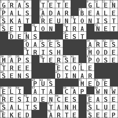 ACROSS 1. Pate de foie ____ 5. False hair 9. Small, secluded valley 13. Friends 14. The sixth month of the Jewish calendar 15. Calif. Air Force Base 16. Three-handed card game 17. One who advocates reunion 19. Put into a specified state 20. Electrically charged atom 21. Lyricist Gershwin 22. Fish or hair follower 23. Habitations of wild animals 25. Eastern Standard Time (abbr.) 26. Fertile tracts in a desert 30. Ancient Greek god of war 34. From or relating to Ireland 35. Method 36. Atlas contents 39. Laconic 42. Introduce or present, as a question 43. Woody plant 44. Learning spot: Fr. 46. Elected reps. 47. Middle Eastern gold or silver currency 48. Purulenc 51. Ancient Persian 54. Connecticut Ivy Leaguer 57. "One Day ___ Time" 58. Head covering 60. Compass dir. 62. Homes 65. Relaxation 66. Table seasonings 67. Hyperbolic tangent 68. Turn sharply 69. Supplemented with great effort 70. Johnson of "Laugh-In" 71. Ooze DOWN 1. Global Positioning Systems (abbr.) 2. Moved through 3. Having winglike extensions 4. Fast jet (abbr.) 5. Pacific island yam 6. Locale of original sin 7. The 19th letter of the Greek alphabet 8. Bert's buddy 9. Commissioned mil. rank 10. (Had) reclined 11. Otherwise 12. Remaining after all deductions 15. Water vessel 18. Big collection agency 20. Austrian river, tributary to the Danube 24. Annoying sounds 27. Be seated 28. Compass dir. 29. Tear up 30. Electrical Unit 31. Friend of Pooh 32. Begley and Asner 33. Perceive with the eye 36. Mountains (abbr.) 37. "We ___ not amused" (Victoria) 38. Writing instrument 40. _-fi 41. Age 45. Desk light 48. Writing tablets 49. Shoshoni 50. Before Barbara or Clara 52. A sleeping potion; an opiate (poet.) 53. Follow as a consequence or result 54. Celtic language 55. Path through which fluid escapes 56. Capri or Wight 58. Penny 59. American tennis player Robert 61. Shed a tear 63. It would 64. 4-wheeled motor vehicle 65. Double-curved letter