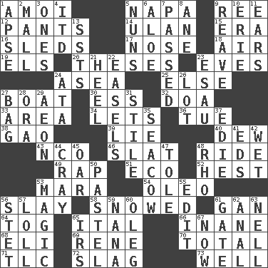 ACROSS 1. Mine, in Marseilles 5. California wine valley 9. To separate or throw off 12. Leg coverings 14. Uhlan (variant) 15. Period 16. Bobsleighs 17. Olfactory organ 18. Wind 19. Raised railways 20. College papers 23. Nights before holidays 24. At sea 25. Otherwise 27. Water vessel 30. Double-curved letter 32. ___ good deed 33. Length times width 34. Allows 36. Third day of the wk. 38. E Mali city 39. Falsehood 40. Morning condensation 43. Non-commissioned officer (abbr.) 46. Narrow board 48. Travel on an animal 49. Strike 51. Environmental prefix 52. Behest 53. Hindu Mythology: god of death 54. Butter sub 56. Kill 58. Overwhelmed 61. Separate the seeds from cotton 64. Coat; cloak 65. Slanted text style (abbr.) 66. Empty; void 68. Biblical high priest 69. French philosopher Descartes 70. Add up to 71. Affectionate concern, for short 72. Volcanic refuse 73. Water source DOWN 1. Domed church section 2. Shopping center 3. Singles 4. It would 5. Religious women 6. Medicinal plant 7. Went by 8. A saturated hydrocarbon 9. Break or tear apart 10. 4th largest of the Great Lakes 11. Hearing organs 13. Fast planes 21. The bottom of a shoe or boot 22. Artist's stands 23. He sold his birthright 24. "One Day ___ Time" 26. Car dealer's back yard 27. Container for groceries 28. Mouth or opening 29. Age 31. Vertical member of a panel or frame 35. Manatee 37. Singer Brickell 41. Begley and Asner 42. Dripping 44. Supercomputer manufacturer 45. Rowing implement 47. Lacquered or enameled metalware 48. 17th letter of the Greek alphabet 50. Soft color 53. Mysterious quality of enchantment 55. Prepare for publication 56. Proofreading order 57. Hang loosely or laxly 59. Nanny 60. Cassini of fashion 61. Yard entry 62. Of or related to the anus 63. 1994 drama film starring Jodie Foster 65. Big collection agency 67. At this time
