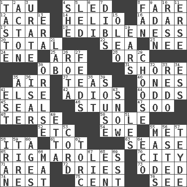 ACROSS 1. The 19th letter of the Greek alphabet 4. Downhill vehicle 8. Conductor's collection 12. 1/640 square mile 14. Sun: prefix 16. The sixth month of the Jewish calendar 17. Play the lead 18. The property of being fit to eat 20. "_____ Recall" 22. Ocean 23. Born 24. Compass dir. 25. Sandy's bark 28. The grampus (Milton) 30. Mitch Miller's instrument 31. Dinah or Pauly 35. Wind 37. Beverages made from leaves 40. Washington bills 41. Otherwise 42. Goodbye (Sp.) 44. Likelihood 45. Lick closed 46. Make senseless or dizzy 47. "Barney Miller" actor Jack 48. Laconic 50. Not divided or shared with others 52. And so on (abbr.) 54. She-sheep 55. Was introduced to 58. Call ___ day 61. Small child 63. Gospel singer Marvin 65. Frustrating wastes of time 70. Municipality 71. Length times width 72. Frees from moisture 73. Wrote a lyric poem 74. Egg locale 75. Penny 76. Observe DOWN 1. Clothes sense 2. NE Massachussets city 3. A salt of uric acid 4. A female animal or person 5. Directed 6. Connecticut Ivy Leaguer 7. Rights 8. Avid follower 9. Arabian gulf 10. To erase 11. Celtic language 13. Epoch 15. Butter sub 19. Hearing organs 21. Experiment locale 26. Roll call or roster of names 27. Gives food to 29. Elect 30. Threatening words 32. Southwest Nigerian state 33. Make new 34. Curvy letter 35. Toward shelter 36. Austrian river, tributary to the Danube 38. Small island 39. Boozer 41. Eastern Standard Time (abbr.) 43. Frozen precipitation 49. Singer James 51. French article 53. Drawstring 55. Unmarried girls 56. First name in cosmetics 57. Miss Universe 1986, Barbara Palacios _ 58. SW Asia republic 59. Hoop that covers a wheel 60. Grows older 62. Torque (variant) 64. Environmental prefix 66. Floor protector 67. Untruth 68. Car or cant ending 69. Fast jet (abbr.)