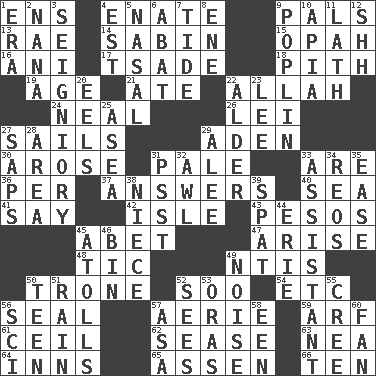 ACROSS 1. Followers of ems 4. Maternal 9. Friends 13. Actress Charlotte 14. Unit of acoustic absorption 15. Brightly colored fish 16. Black tropical American cuckoo 17. Sadhe (variant) 18. Heart or essence 19. Mature 21. Had dinner 22. Assad's deity 24. Actress Patricia 26. Luau accessory 27. Moves on water 29. An important port of Yemen 30. Came up 31. Light colored 33. "We ___ not amused" (Victoria) 36. For each 37. Responds (to) 40. Ocean 41. Declare 42. Capri or Wight 43. Mexican monetary units 45. Collude with 47. Get up 48. Nervous spasm 49. Nuclear Threat Initiatives 50. Heavy duty weighing machine 52. "Barney Miller" actor Jack 54. And so on (abbr.) 56. Lick closed 57. Nest on high 59. Sandy's bark 61. To provide with a ceiling 62. Gospel singer Marvin 63. Teachers' org. 64. Taverns 65. NE Netherlands city 66. "___ Little Indians" DOWN 1. Epoch 2. Grandmother 3. Signiory (variant) 4. Eastern Standard Time (abbr.) 5. Rhinal 6. Blind as ____ 7. Periodic rise and fall of the sea level 8. Compass dir. 9. Cotton for raincoats, e.g. 10. Capital of Western Samoa 11. Thin strip of wood or metal 12. Quiet! 20. Snakelike fish 22. Tree or shrub in the Birch family 23. Area sheltered from the wind 25. At sea 27. Plant excrements 28. Length times width 29. Toward shelter 31. Inconspicuous attention getter 32. Leather borer 33. Helper 34. Vintage cars 35. Relaxation 38. Sibling's daughter 39. Petty quarrel 44. 4th largest of the Great Lakes 45. Ringlike coral islands and reefs 46. Storage container 49. Annoying sound 50. Adolescent 51. Water falling in drops from the sky 52. Perceives with the eye 53. Mouths or openings 55. Algonquian 56. _-fi 57. White ___ sheet 58. Car or cant ending 60. Air blower