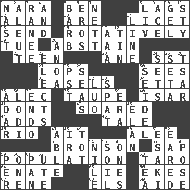 ACROSS 1. Hindu Mythology: god of death 5. Benjamin's nick name 8. Straggles 12. ____ Jay Lerner 13. "We ___ not amused" (Victoria) 14. It is permitted: Lat. 15. Transmit 16. Happening in regular succession 19. Third day of the wk. 20. Choose not to consume 21. Adolescent 23. A saturated hydrocarbon 24. Fast jet (abbr.) 27. Chops off 30. Perceives with the eye 31. Artist's stands 34. Singer James 35. Actor Baldwin 38. Grayish beige 40. Austrian river, tributary to the Danube 41. Do not 42. Flew 44. Sums up 45. Falsehood 46. River (Sp.) 47. Small island 50. Toward shelter 53. "Death Wish" actor 57. Plant excrement 59. Census information 63. Pacific island yam 64. Related on the mother's side 65. Falsehood 66. Makes supply last 67. French philosopher Descartes 68. Raised railways 69. Helper DOWN 1. Vertical spar for supporting sails 2. Native American of Southwest Alaska 3. The wife of a rajah (variant) 4. Added to 5. Sharp remark 6. Greek god of love 7. Remaining after all deductions 8. 54 in ancient Rome 9. Adept person 10. Set 11. Filthy place 14. Actor's bit 17. Auto club (abbr.) 18. Shallow baking pan 20. Small Philippine buffalo 22. Chooses 24. Puts into a specified state 25. Stalk of a moss capsule 26. Russian ruler of old 28. Pacific Standard Time (abbr.) 29. Oceans 30. A glass for beer 32. Nilotic language 33. Petty quarrel 35. The sixth month of the Jewish calendar 36. Farming town in central California 37. Inside; within (prefix) 39. Epoch 43. Liveliness 47. Competent 48. Lyricist Gershwin 49. Small child 51. 1973 Nobel Price Winner (Physics) Leo 52. Having ears or earlike features 54. "Death on the ____" 55. The visible part of the earth's surface 56. Singles 58. Introduce or present, as a question 59. For each 60. Single 61. Baking dish 62. Shoshoni 63. Beverage made from leaves