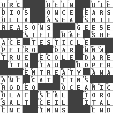 ACROSS 1. The grampus (Milton) 4. It's straight from the horse's mouth 8. Expire 11. "Vaya con ____" 13. Single time 14. Hearing organs 15. Spanish pot 16. Toward the sea 17. In a ____ (agitated or irritated) 18. Thinks logically 21. Honkers 22. Proofreading order 23. Actress Charlotte 25. A female animal or person 26. Adept person 29. A testis 32. Stone: prefix 34. Rowing implement 35. Compass dir. 38. Loyal 39. Learning spot: Fr. 41. Have the gumption 43. Shallow baking pan 44. The 19th letter of the Greek alphabet 45. Drug addict 46. Plea 50. Santa ___, CA 51. A saturated hydrocarbon 54. Feline 55. Metal containers 57. Cowboy competition 59. Pertaining to the sea 63. Norwegian king 64. Lick closed 67. "Corrida" creature 68. Table seasoning 69. To provide with a ceiling 70. Slanted text style (abbr.) 71. Compass dir. 72. Restaurants 73. Conclude DOWN 1. Scent 2. Cause heat under the collar 3. Root beer relative 4. Exposes to great heat 5. Followers of ems 6. Frozen water 7. Teachers' org. 8. Natives or inhabitants of Denmark 9. From or relating to Ireland 10. First name in cosmetics 12. Backtalk 14. Compass dir. 19. Von Bismarck 20. Born 21. Set 23. Monetary unit of Yemen 24. Measure of real estate 26. Fitting 27. Foregone conclusion 28. Needle holder 30. Woman's close-fitting hat 31. Inside; within (prefix) 33. French philosopher Descartes 36. California wine valley 37. Songbird 39. Singer James 40. Heavy open wagon 42. Period 45. Unit of force 47. Non-commissioned officer (abbr.) 48. Ringlike coral islands and reefs 49. Nervous spasm 51. Came up 52. Pitcher Ryan 53. Peak District village in England 56. Suttee (variant) 58. Bank Draft (abbr.) 60. Musical sound 61. SW Asia republic 62. Lacking warmth 64. _-fi 65. Car or cant ending 66. The 18th letter of the Arabic alphabet