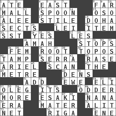 ACROSS 1. Had dinner 4. Compass direction 8. At a great distance 11. Promenade 13. Soup utensil 15. Bear (Spanish) 16. Toward shelter 17. Vertical member of a panel or frame 18. Capital of the state of Qatar 19. Religious groups 21. Flowery wreath 22. A distinct part 23. Fast jet (abbr.) 24. It is so 27. French article 29. Wet nurse 30. Obstructs or blocks passage 34. Opposite of masc. 36. Carrot, for example 39. Literary convention 40. Pack (down) 41. Father Junipero _ 43. Raze (variant) 44. Satellite of Uranus 46. Examine hastily 47. Definite Article 48. Distance measurement (Brit.) 49. Hiding places for outlaws 51. Increase 53. She-sheep 54. Connecticut Ivy Leaguer 57. Cassini of fashion 60. It is 63. More peculiar 65. Greater amount 66. 1973 Nobel Price Winner (Physics) Leo 69. Nanny 70. Epoch 71. Mother 72. Came down and settled, as after flight 73. Fish or hair follower 74. Port city in Latvia 75. Compass dir. DOWN 1. Collect or gather 2. Stories 3. Opt 4. Double-curved letter 5. Fitting 6. Land 7. Lacquered or enameled metalware 8. Lowest support of a structure 9. American tennis player Robert 10. Wander aimlessly 12. Allow 14. Famous astronaut Armstrong 18. What propaganda does 20. Symbol (abbr.) 25. Hearing organs 26. Imelda's hoard 28. Eastern Standard Time (abbr.) 29. Electrical Measurement 31. Brightly colored fish 32. Airs 33. Compass dir. 34. Conductor's collection 35. Send forth 37. The grampus (Milton) 38. Exchange 40. Scottish cap 42. Afresh 45. Directed 50. Modern: prefix 52. South Vietnam president (1954) 54. Peak District village in England 55. Soviet premier 1918-24 56. Feeling or showing extreme anger 57. Sign of things to come 58. Old wives' tales, e.g. 59. Part of Q.E.F. 61. Russian ruler of old 62. Suttee (variant) 64. Heredity factor (abbr.) 67. Barrel 68. Retirement account (abbr.)