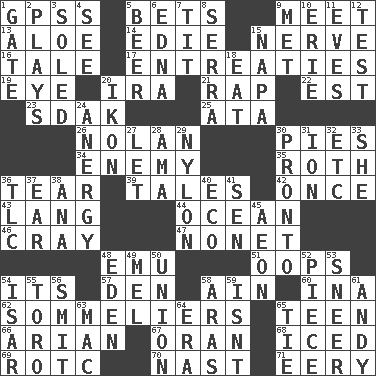 ACROSS 1. Global Positioning Systems (abbr.) 5. Wagers 9. Rendezvous 13. _ vera 14. Singer Brickell 15. Impudent aggressiveness 16. Falsehood 17. Pleas 19. Sight organ 20. Retirement account (abbr.) 21. Reproach for some lapse or misdeed 22. Eastern Standard Time (abbr.) 23. Neighbor of Neb. 25. _ moment's notice (2 wds.) 26. Pitcher Ryan 30. Sliced desserts 34. Foe 35. Writer of Portnoy's Complaint (1969) 36. Lacerate 39. Falsehoods 42. At one time in the past 43. Long (Scottish) 44. Sea 46. Supercomputer manufacturer 47. Music written for nine 48. Australian flightless bird 51. I made a mistake 54. It is 57. Lair 58. The 18th letter of the Arabic alphabet 60. _ tizzy (2 wds.) 62. Wine waiters 65. Adolescent 66. Believer in; advocate of (suffix) 67. NW Algerian seaport 68. On the rocks 69. College mil. group 70. Political cartoonist Thomas 71. Suggestive of the supernatural DOWN 1. Yard entry 2. Romps 3. Having a sole or soles 4. Observe 5. Fermented drink made from hops 6. Pulitzer Prize-winning author Ferber 7. Teat (slang) 8. Father Junipero _ 9. Was introduced to 10. One of the Great Lakes 11. Nights before holidays 12. Trial 15. California wine valley 18. Consume 20. Image 24. Disorder of the immune system 27. Allow 28. Housemaid (var.) 29. Thermoplastic polyamide 30. Right away 31. Electrically charged atom 32. And so on (abbr.) 33. A female animal or person 36. Affectionate concern, for short 37. Hearing organ 38. Santa ___, CA 40. Environmental prefix 41. Elected rep. 45. Period of immesurable duration 48. Locale of original sin 49. Cartoonist voice _ Blanc 50. The state of being joined or united 52. Component 53. Scornful expression 54. Austrian river, tributary to the Danube 55. "Corrida" creature 56. Stricken, poetically 58. Caspian sea tributary 59. Is not 61. Actor Griffith 63. Apple computer (short form) 64. Epoch 65. Standoff
