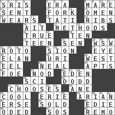ACROSS 1. Indian titles of respect 5. Period 8. Female horse 12. Transmitted 13. Tined utensil 15. Sign of things to come 16. Erodes 18. Jacques of French films 19. Teases 20. Small island 22. Modes 24. Loyal 26. "___ Little Indians" 27. Adolescent 28. Elected rep. 29. Compass dir. 32. Printing process, for short 35. The Jewish people; Israel 37. Sight organ 38. Flair 39. RI univ. 40. 270 degrees 41. Snakelike fish 42. Anneal 43. Flats, for short 44. Enemy 45. Lower and raise head in agreement 46. Locale of original sin 49. _-fi 50. Texas town _ City 51. Elects 55. A saturated hydrocarbon 56. Calm and collected 57. One of the Great Lakes 59. Believer in; advocate of (suffix) 63. Celtic language 64. Exchanged or delivered for money 65. Singer Brickell 66. Wrote a lyric poem 67. Mayday 68. San ____ (Riviera town) DOWN 1. Compass dir. 2. Portuguese money of account (variant) 3. _ tizzy (2 wds.) 4. Ski resort town in Vermont 5. Bank Draft (abbr.) 6. Wander aimlessly 7. Johnson of "Laugh-In" 8. Person of subnormal intelligence 9. Among 10. Confederate soldiers (slang) 11. Followers of ems 14. Baby cat 17. Father 21. Third day of the wk. 23. Layer 25. Took place subsequently 28. Dirtied 29. Shed a tear 30. System (abbr.) 31. Moistens 32. Coral ridge 33. Margarine 34. Falsehood 36. Retirement account (abbr.) 40. Nomad 42. Annoying sounds 45. Non-commissioned officer (abbr.) 47. ___ good deed 48. Pulitzer Prize-winning author Ferber 49. Having a sole or soles 51. Drawstring 52. Flexible conduit 53. Greek god of love 54. Grain storage tower 56. Corporate head (abbr.) 58. Begley and Asner 60. Binary compound 61. Direct toward a target or goal 62. Modern: prefix