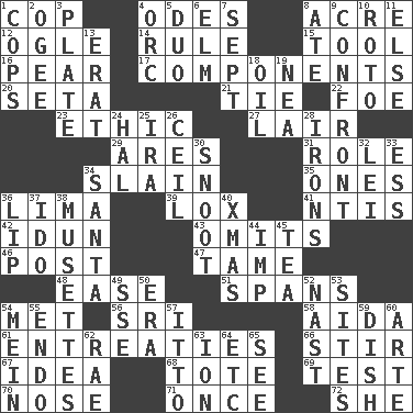 ACROSS 1. Police officer (slang) 4. Lyric poems 8. Measure of real estate 12. Stare at amorously 14. Court order 15. Utensil 16. Lightbulb-shaped fruit 17. Parts 20. Stalk of a moss capsule 21. Standoff 22. Enemy 23. Value system 27. Den 29. Ancient Greek god of war 31. Hero or heavy, e.g. 34. Killed 35. Singles 36. Pale green bean 39. Brine-cured salmon 41. Nuclear Threat Initiatives 42. Goddess of spring and wife of Bragi 43. Leaves out 46. Mail 47. Docile 48. Comfort 51. Connects, as a bridge 54. Was introduced to 56. Indian title of respect (Mr.) 58. Opera by Verdi 61. Pleas 66. Use a spoon 67. It may be bright or harebrained 68. Lug 69. Trial 70. Characteristic smell of wine 71. At one time in the past 72. A female animal or person DOWN 1. 911 reaches them 2. Double curve, resembling the letter S 3. Food holder 4. The grampus (Milton) 5. Superhero pair 6. Shade tree 7. Back-to-school mo. 8. Had dinner 9. Meet 10. Printing process, for short 11. Otherwise 13. Part of Q.E.F. 18. Petroleum 19. Teachers' org. 24. Actor Linden 25. Lyricist Gershwin 26. To provide with a ceiling 28. Metal shackles 30. Snout, nose 32. Luau accessory 33. Curvy letter 34. Before Barbara or Clara 36. Mouth edge 37. Wedding promise 38. French bagpipes 40. Dec. holiday 44. Naughty child 45. Beverage made from leaves 49. Compass dir. 50. Period 52. Political cartoonist Thomas 53. Locates 54. Chow _ 55. Inside; within (prefix) 57. "Tell ____ the Marines!" 59. Food container 60. Johnson of "Laugh-In" 62. Actress Charlotte 63. Electrically charged atom 64. And so on (abbr.) 65. Observe