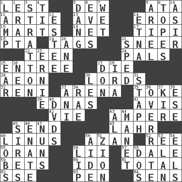 ACROSS 1. For fear that 5. Morning condensation 8. _ moment's notice (2 wds.) 11. Nick name for Arthur 13. "___ Maria" 14. Greek god of love 15. Shops 16. Fish or hair follower 17. Native american tent (variation) 18. Parent Teacher Association (abbr.) 19. Labels 21. Contemptuous expression 22. Adolescent 24. Friends 25. Main course 27. Pass on 29. Age 30. Titled peers of a realm 32. Painter Guido (1575-1642) 33. Sports stadium 35. Puff or smoke 39. Ferber et al. 41. Opinion 42. Compete 43. Electrical Unit 45. Post 48. Cowardly lion portrayer 49. "_ and Lucy" (Charlie Brown theme song) 50. Muslim summons to prayer 52. To separate or throw off 55. Northwest Algerian city 56. Cards in a Roman deck? 57. Peak District village in England 59. Wagers 60. Wedding promise 61. Add up to 62. Compass dir. 63. Animal enclosure 64. Elected reps. DOWN 1. Desk light 2. Part of Q.E.F. 3. Ski resort town in Vermont 4. Teat (slang) 5. Mild oath, euphamism for damn 6. Nights before holidays 7. Soggy 8. Satellite of Uranus 9. Drinks excessively 10. SW Saudi Arabia district 12. First name in cosmetics 14. Inactive volcano in Sicily 20. A saturated hydrocarbon 21. Broke a traffic law 23. Bert's buddy 25. Hearing organ 26. Born 27. Spanish title 28. Lyricist Gershwin 30. French article 31. Staphylococcus 33. Black tropical American cuckoo 34. Actress Charlotte 36. Make much ado about nothing 37. Apertif with cassis 38. Compass dir. 40. Movie discs 43. Insect wing 44. French painter Edouard 45. Begets 46. Maternal 47. Religious women 49. Tennis shots 50. Assistant 51. The Jewish people; Israel 53. Liveliness 54. Snakelike fish 56. Mouth edge 58. Two (Sp.)