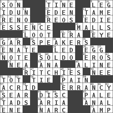 ACROSS 1. Boy, to dad 4. Prong on a fork 8. Part of a journey 11. Goddess of spring and wife of Bragi 13. Genesis locale 14. Not wild 15. Western Nevada city 16. Vintage cars 17. Singer Brickell 18. Core 21. Promenades 22. Spoils 23. Epoch 25. Sight organ 26. Slender fish 29. Orators 32. Maternal 34. Directed 35. Oval reproductive body of a fowl 38. Make mention of 39. Twentieth part of a lira 41. Greek god of love 43. Teachers' org. 44. Santa ___, CA 45. Place in a line 46. Actors Guy, Robert Welles, and Clint 50. Born 51. Small child 54. Standoff 55. Ache 57. Bitter 59. The state or an instance of erring 63. Singe 64. Plate 67. Diluted with white 68. Small boys 69. Operatic vocal solo 70. Of or related to the anus 71. Compass dir. 72. Drug cop 73. Electrical Unit DOWN 1. Beget 2. Lyric poems 3. Religious women 4. Cylindrical with tapered ends 5. Binary compound 6. Modern: prefix 7. Followers of ems 8. Dipping utensil 9. Poet Dickinson 10. Honkers 12. Christmas carol 14. Beverage made from leaves 19. Characteristic smell of wine 20. Police officer (slang) 21. Third mo. 23. Supplemented with great effort 24. Redecorate 26. Commissioned mil. rank 27. At once, immediately (arch.) 28. Assign a rank or rating to 30. Assad's deity 31. Stitch closed the eyes of (a falcon) 33. Rend 36. Amused look 37. Went 39. Suttee (variant) 40. At one time in the past 42. Observe 45. SW Saudi Arabia district 47. It would 48. Medicinal drug used to evoke vomiting 49. Ewer handle 51. Clothes sense 52. Sea 53. Exchange 56. California wine valley 58. Big collection agency 60. Nanny 61. Dollar (slang) 62. Sharp bark 64. Daniel's nick name 65. Retirement account (abbr.) 66. Title for a knight