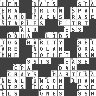 ACROSS 1. Layer 4. Raised platform 8. Ocean 11. Epoch 12. Greek mythologigal hunter 14. Petty quarrel 15. Billionth: prefix 17. Aches 18. Raze (variant) 19. Paper fasteners 21. Seductive woman who exploits men 23. Atmosphere 24. Double-curved letter 25. Capital of the state of Qatar 27. Hats (slang) 30. Coat; cloak 31. Noteworthy scarcity 34. Arrange properly for use 37. "We ___ not amused" (Victoria) 38. Pitcher Ryan 39. Mouth or opening 40. Madame (abbr.) 41. Rest room 43. Compass dir. 44. Fast planes 45. Comfort 47. Tax preparer (abbr.) 49. Daniel's nick name 50. Trading vessels 52. Chrissie's court nemesis 56. Be tempered by heat 57. The state of being joined or united 60. SW Asia republic 61. Pinches, bites 62. Learning spot: Fr. 63. Sight organ 64. Raised railways 65. Singles 66. Compass dir. DOWN 1. Coop moms 2. Part of Q.E.F. 3. Grandmother 4. Drug addict 5. Caspian sea tributary 6. One more than two 7. Manchild 8. Practice fights 9. 90 degrees 10. Had dinner 13. Overdraft (abbr.) 14. Indian titles of respect 16. Brightly colored fish 20. One who doesn't tell the truth 22. French article 25. Dormintory (informal) 26. Double curve, resembling the letter S 27. Ms. Damita and namesakes 28. Slanted text style (abbr.) 29. Centimeter-gram-second unit of force 30. Scottish cap 32. Pismires 33. Carrot, for example 34. Sty mamas 35. Celtic language 36. The 23rd letter of the Hebrew alphabet 42. Separate forcefully 44. Declare 46. Opposed to 47. Dice game 48. Friends 49. Natives or inhabitants of Denmark 50. To provide with a ceiling 51. Take to court 52. Undercover agent 53. Angers 54. Negative votes 55. Afresh 56. Compass dir. 58. Non-commissioned officer (abbr.) 59. Electrically charged atom