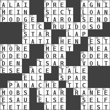 ACROSS 1. Mountain range southwest of Kyrgyzstan 5. Before (prefix) 8. Hindu god of fire 12. Chow _ 13. Religious group 15. Grant temporary use of 16. Plash 18. Pacific island yam 19. Post 20. And so on (abbr.) 22. Noisy, rowdy, vocal (Spanish) 24. Play the lead 26. Pet locale 27. Jacques of French films 28. Layer 29. Eastern Standard Time (abbr.) 32. Greater amount 35. Rendezvous 37. Teachers' org. 38. Wrote a lyric poem 39. Mouth or opening 40. River in Europe 41. Lair 42. Austrian river, tributary to the Danube 43. Electrical Unit 44. Compass dir. 45. Adept person 46. Story 49. Biblical high priest 50. Coast Guard woman 51. Flamboyance 55. Nervous spasm 56. Crowds into 57. One who doesn't tell the truth 59. Indian princess (variant) 63. He sold his birthright 64. Otherwise 65. Automatically 66. False hair 67. Area sheltered from the wind 68. Trial DOWN 1. Electrical Unit 2. Lion 3. Assist 4. Eaten 5. Pacific Standard Time (abbr.) 6. Stern 7. Shade of tan 8. Columnist Joseph or Stewart 9. Moves 10. Billionth: prefix 11. Working for oneself (abbr.) 14. Bathroom 17. Singer James 21. Feline 23. One of the 12 tribes of Israel 25. Full of chinks, cracks, or crevices 28. Centers 29. Inside; within (prefix) 30. Stitch closed the eyes of (a falcon) 31. Small pie 32. Method 33. Lyric poems 34. French philosopher Descartes 36. Period 40. Cloudy 42. Hanging ice 45. Wing 47. Fitting 48. Den 49. Take place subsequently 51. Introduce or present, as a question 52. Blind as ____ 53. Land elevation 54. Relaxation 56. Was introduced to 58. To sift 60. Born 61. Raised railways 62. Lizard (obsolete)