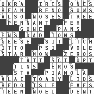 ACROSS 1. Gumbo ingredient 5. Angers 9. Singles 13. 480, 500 or 516 sheets of paper 14. Western Nevada city 15. Sty mamas 16. In addition 17. Olfactory organs 18. Family _ (genealogy) 19. Pre-World Series prize 21. Opposite of masc. 22. Went 23. Baking dishes 24. Followers of ems 27. June honoree 28. Charged particles 29. Honkers 31. Be seated 32. Hankering 36. "Tell ____ the Marines!" 37. 23rd letter of the Greek alphabet 38. Short-tailed, large-bodied rat 39. Play the lead 40. Cut the grass 41. Nothings 42. Jacques of French films 44. _-fi 46. Elect 47. Metal containers 48. Greek god of love 50. R.R. building 51. Player piano 54. Jai ____ 56. Sycophant 58. Flaplike coverings 60. Do over again 61. Small island 62. Nights before holidays 63. Adolescent 64. Christmas carol 65. Scratch DOWN 1. Mouth or opening 2. Seaweed 3. Raze (variant) 4. Amid 5. Pressed 6. Remainder 7. Compass dir. 8. Mayday 9. Clearly or manifestly demonstrative 10. Typical standards 11. She-sheep 12. Compass dir. 17. Grandmother 20. Connecting point 21. Air blower 23. Plant holder 24. The front part of a cuirass 25. Remaining after all deductions 26. Bristle 28. One more than two 30. Casting lots 31. Compass dir. 33. "Corrida" creature 34. Hoof sound 35. Behest 37. Luau course 40. Mountains (abbr.) 41. The Jewish people; Israel 43. Santa ___, CA 44. Beer mug 45. Supercomputer manufacturer 47. Sadhe (variant) 49. Having a sole or soles 51. Diluted with white 52. Moving, as bait 53. Arabian gulf 54. Tate display 55. Area sheltered from the wind 56. Metal container 57. Bear (Spanish) 59. Fast jet (abbr.)