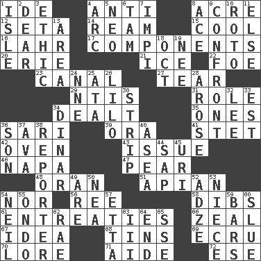 ACROSS 1. Binary compound 4. Opposed to 8. 1/640 square mile 12. Stalk of a moss capsule 14. 480, 500 or 516 sheets of paper 15. Calm and collected 16. Cowardly lion portrayer 17. Pieces 20. One of the Great Lakes 21. Frozen water 22. Enemy 23. Lessep's creation 27. Lacerate 29. Nuclear Threat Initiatives 31. Hero or heavy, e.g. 34. Started a card game 35. Washington bills 36. Indian skirt 39. Mouth or opening 41. Proofreading order 42. Baking chamber 43. Come out of 46. California wine valley 47. Lightbulb-shaped fruit 48. NW Algerian seaport 51. Bee-related 54. And not 56. Portuguese money of account (variant) 58. Rights 61. Pleas 66. Ardor 67. The main thing one is thinking about 68. Canisters 69. Shade of tan 70. Old wives' tales, e.g. 71. Helper 72. Compass dir. DOWN 1. Small island 2. Letter starter 3. Principle of right and wrong 4. Curve 5. Modern: prefix 6. Scottish cap 7. Body of Kaffir warriors 8. Adept person 9. Meet 10. Printing process, for short 11. Otherwise 13. Length times width 18. Sep. follower 19. Born 24. Compass dir. 25. "One Day ___ Time" 26. _ and Stitch 28. Came up 30. Empty completely 32. Area sheltered from the wind 33. Eastern Standard Time (abbr.) 34. Middle Eastern gold or silver currency 36. Manchild 37. Actress Gardner 38. Newsperson 40. At sea 44. Plant excrement 45. RI univ. 49. "We ___ not amused" (Victoria) 50. Teachers' org. 52. Edge tool used to cut and shape wood 53. Sibling's daughter 54. Famous astronaut Armstrong 55. Southwest Nigerian state 57. Singer James 59. Taverns 60. Change direction abruptly 62. Actress Charlotte 63. One more than two 64. Conclusion 65. Compass dir.