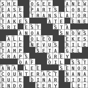 ACROSS 1. A female animal or person 4. Double curve, resembling the letter S 8. Afresh 12. Comfort 14. Actors' quests 16. Ear part 17. Ancient river in northeast Turkey 18. Interpreter 20. Proceeds 22. Had dinner 23. Compass dir. 24. Indian title of respect (Mr.) 25. Eastern Standard Time (abbr.) 28. R.R. building 30. Small Philippine buffalo 31. Frozen precipitation (plural) 35. Everything 37. Butter sub 40. Supplements with great effort 41. Singer Brickell 42. Mole, birthmark 44. Cause heat under the collar 45. Pack (down) 46. Bristle 47. Set 48. Dice game 50. Jennifer or Joel 52. Clumsy lout 54. Petroleum 55. Fast jet (abbr.) 58. Santa ___, CA 61. Area sheltered from the wind 63. Sir (Sp.) 65. Act in opposition 70. Nanny 71. Court order 72. Middle Eastern gold or silver currency 73. "You Light Up My Life" star Conn 74. Inside; within (prefix) 75. Suggestive of the supernatural 76. Allow DOWN 1. Theater features 2. Ethiopian city, capital of Harari 3. 1973 Nobel Price Winner (Physics) Leo 4. Elect 5. Slender fish 6. Period 7. Inactive volcano in Sicily 8. According to 9. Brief written record 10. Inky black, to poets 11. We are 13. Compass dir. 15. Fast planes 19. Allows 21. Elected rep. 26. Within a short period 27. Stories 29. Disorder of the immune system 30. City in Syria 32. Migrant worker of the '30s 33. Water source 34. Compass dir. 35. The sixth month of the Jewish calendar 36. Pale green bean 38. Night before a holiday 39. Expenditure 41. And so on (abbr.) 43. Indian skirt 49. Table seasoning 51. Raised railways 53. Nourish 55. Slow-paced one 56. Something which is sent 57. Distinguishing feature 58. Measure of real estate 59. Part of speech 60. Old (Scot.) 62. One of the Great Lakes 64. Conclusion 66. Modern: prefix 67. One (Scot) 68. Automobile 69. Attempt