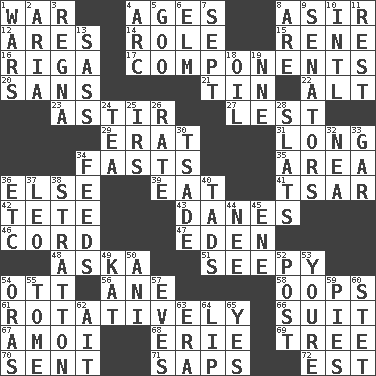 ACROSS 1. Armed conflict 4. Grows older 8. SW Saudi Arabia district 12. Ancient Greek god of war 14. Hero or heavy, e.g. 15. French philosopher Descartes 16. Port city in Latvia 17. Pieces 20. Without 21. Shallow baking pan 22. Keyboard modifier key 23. Moving about 27. For fear that 29. Part of Q.E.F. 31. Protracted 34. Goes without food and/or water 35. Type of rug 36. Otherwise 39. Ingest 41. Russian ruler of old 42. False hair 43. Natives or inhabitants of Denmark 46. Drawstring 47. Paradise 48. "____ silly question..." 51. Not well drained, as in land 54. Baseball player Mel 56. A saturated hydrocarbon 58. I made a mistake 61. Producing rotation 66. Set of matching outer garments 67. Mine, in Marseilles 68. One of the Great Lakes 69. Relationship diagram 70. Transmitted 71. Plant excrements 72. Eastern Standard Time (abbr.) DOWN 1. Armed conflicts 2. Roberta Peters solo 3. Rain (Swedish) 4. Curve 5. Thick or sticky substance 6. Shade tree 7. Back-to-school mo. 8. "We ___ not amused" (Victoria) 9. Elected representatives 10. International (abbr.) 11. Respite 13. Backtalk 18. Lubricate 19. Compass dir. 24. Beverage made from leaves 25. Big collection agency 26. Pace 28. Narrow boards 30. Sadhe (variant) 32. Teachers' org. 33. Slender fish 34. Eats 36. And so on (abbr.) 37. Lion 38. Ski resort town in Vermont 40. Small boys 44. Born 45. Compass dir. 49. Krazy ___ of comics 50. Cuckoo 52. Mail 53. You are 54. Mouths or openings 55. Heavy book 57. Nights before holidays 59. Sliced desserts 60. Proofreading order 62. Small island 63. Epoch 64. Mouth edge 65. It is so