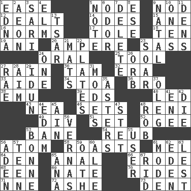 ACROSS 1. Comfort 5. Thickened enlargement 9. Dreamland 12. Started a card game 14. Lyric poems 15. A saturated hydrocarbon 16. Typical standards 17. Lacquered or enameled metalware 18. "___ Little Indians" 19. Cuckoo 20. Electrical Unit 23. Backtalk 24. Relating to the mouth 25. Implement 27. Precipitation 30. Scottish cap 32. Period 33. Assistant 34. Portico 36. Sis' sibling 38. Australian flightless bird 39. Begley and Asner 40. Directed 43. Teachers' org. 46. Arranges properly for use 48. Painter Guido (1575-1642) 49. HTML Container Element 51. Arrange properly for use 52. Double curve, resembling the letter S 53. Object of repulsion 54. Reuben's nickname 56. Tiny particle 58. Ridicules or criticizes harshly 61. Cartoonist voice _ Blanc 64. Lair 65. Of or related to the anus 66. Wear away 68. Car or cant ending 69. Nathan's nickname 70. Amusement-park features 71. Compass dir. 72. American tennis player Robert 73. Scratch DOWN 1. Pulitzer Prize-winning author Ferber 2. Age 3. Indian skirt 4. Shade tree 5. Make mention of 6. Scent 7. Erase 8. Compass dir. 9. Brizilian seaport 10. Singles 11. Habitations of wild animals 13. Russian ruler of old 21. Floor coverings 22. Food holders 23. Fly high 24. Single 26. Globe 27. Actress Charlotte 28. Direct toward a target or goal 29. Goddess of spring and wife of Bragi 31. Methods 35. Michaelmas daisies 37. Cassini of fashion 41. Compass dir. 42. Pass on 44. Dutch treat 45. The 18th letter of the Arabic alphabet 47. Proofreading order 48. Director Reiner 50. Actresses Bloom and Felton 53. Maid-servant 55. One who makes use of a thing 56. Arabian gulf 57. Adolescent 59. Pledge 60. Toward shelter 61. Method 62. Paradise 63. For fear that 65. Santa ___, CA 67. To free from