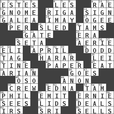 ACROSS 1. _____ Park, CO 6. French article 9. Actress Charlotte 12. Dwarf 13. Port city in Latvia 14. Omen 15. An organ shaped like a helmet 16. "If ____ say so..." 17. Double curve, resembling the letter S 18. For each 19. Downhill vehicle 20. Scottish caps 21. Yard entry 23. Period 24. Bristle 25. Nest on high 28. Connecticut Ivy Leaguer 30. Showery time 34. Texas town _ City 35. Label 36. Ethiopian city, capital of Harari 38. Luau accessory 39. Prong on a fork 41. Some stationery 43. Ingest 44. Believer in; advocate of (suffix) 46. Moves 48. Bear (Spanish) 49. At once, immediately (arch.) 50. Ship's personnel 51. Pulitzer Prize-winning author Ferber 53. Scottish cap 56. Silvers or Donahue 57. Send forth 58. Bert's buddy 60. Observes 61. Flaplike coverings 62. Allots cards 63. Big collection agency 64. Indian title of respect (Mr.) 65. Exchanges for money DOWN 1. Ovum 2. Fastener 3. Lacquered or enameled metalware 4. Develop 5. Ocean 6. Welles in "The Third Man" 7. Mild oath 8. Declare 9. Frustrating wastes of time 10. Eons 11. Compass dir. 13. Cause heat under the collar 14. Flew 19. Staphylococcus 20. Afternoon social gathering 22. _ moment's notice (2 wds.) 24. Seigniories (variant) 26. The main thing one is thinking about 27. Prepare for publication 28. Singer James 29. Den 31. Hit sharply and swiftly 32. Lyricist Gershwin 33. Infant locale 37. Canadian anthropologist Darnell 40. Artist's stands 42. Friend of Pooh 45. Immediately 47. Main course 49. Pismires 50. "Mermaids" star 51. Independent ruler or chieftain 52. "You Light Up My Life" star Conn 54. Of or related to the anus 55. Place where flour is made 56. 23rd letter of the Greek alphabet 57. Raised railways 58. Begley and Asner 59. Curvy letter