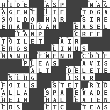 ACROSS 1. Travel on an animal 5. Cleo's killer 8. Tired old horse 11. Rep 13. Untruth 14. Ancient Roman robe 15. Twentieth part of a lira 16. Make imperfect 17. Title for a man of rank and authority 18. Epoch 19. Wander 21. Artist's stand 22. Pack (down) 24. Algonquian 25. Bathroom plumbing fixture 27. Atmosphere 29. Greek god of love 30. "_ and Lucy" (Charlie Brown theme song) 32. Billionth: prefix 33. Make improvements or corrections to 35. ____ d'Azur (French Riviera) 39. Entreaties 41. Opinion 42. Keyboard modifier key 43. Erase 45. Strike heavily 48. Austrian river, tributary to the Danube 49. Fencing necessities 50. Proofreading order 52. To free from 55. Silent film actress Nazimova 56. Health resort 57. Dodge 59. It's straight from the horse's mouth 60. Actor Linden 61. Consumed 62. Begley and Asner 63. And so on (abbr.) 64. Beverages made from leaves DOWN 1. To erase 2. Russian composer Stravinsky 3. Conveyance 4. Conclude 5. _ mater 6. Thailand, formerly 7. For each 8. Annoying sound 9. Match 10. Highlander 12. Singer Mel 14. Russian ruler of old 20. Choose 21. Shade of tan 23. Columnist Joseph or Stewart 25. Nine, plus one 26. Mouth or opening 27. The 18th letter of the Arabic alphabet 28. Indiana (abbr.) 30. French article 31. Any of the three canals of the cochlea 33. Snakelike fish 34. Floor covering 36. Make much ado about nothing 37. Teat (slang) 38. Compass dir. 40. Straggles 43. Pass on 44. First name in cosmetics 45. Having a sole or soles 46. Ms. Damita and namesakes 47. ____ Bator 49. Conductor's collection 50. Argument over a trivial matter 51. Baby powder 53. The content of cognition 54. Hiding places for outlaws 56. A female animal or person 58. Large container