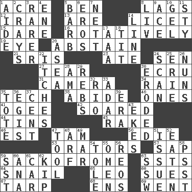 ACROSS 1. 43,560 square feet 5. Benjamin's nick name 8. Falls behind 12. SW Asia republic 13. "We ___ not amused" (Victoria) 14. It is permitted: Lat. 15. Have the gumption 16. Producing rotation 19. Sight organ 20. Refrain by choice 21. Indian titles of respect 23. Had dinner 24. Elected rep. 27. Lacerate 30. Shade of tan 31. Device for capturing images 34. Precipitation 35. Technical 38. Remain 40. Singles 41. Double curve, resembling the letter S 42. Flew 44. Canisters 45. Immoral or dissolute person 46. Eastern Standard Time (abbr.) 47. Scottish cap 50. Singer Brickell 53. Speakers 57. Plant excrement 59. Italian handbag shop? 63. Fast planes 64. Slow-paced one 65. Lion 66. Institutes legal proceedings 67. Canvas cover 68. Followers of ems 69. Left DOWN 1. Assistant 2. Trading vessels 3. More uncommon 4. Compass dir. 5. Sharp remark 6. Greek god of love 7. Remaining after all deductions 8. 54 in ancient Rome 9. Adept person 10. Set 11. Filthy place 14. Actor's bit 17. American Automobile Association (abbr.) 18. Teat (slang) 20. At sea 22. Strong, restless desires 24. Glance over 25. 4th largest of the Great Lakes 26. Religious women 28. Nanny (var.) 29. Confederate soldiers (slang) 30. Worn away 32. _ de Janeiro 33. The sixth month of the Jewish calendar 35. Carry 36. The front part of a cuirass 37. Penny 39. Epoch 43. Supplements with great effort 47. Implement 48. Sandy's bark 49. Make imperfect 51. Come out of 52. Consumed 54. Lacquered or enameled metalware 55. Sign of something about to happen 56. Vintage cars 58. Inconspicuous attention getter 59. Fast jet (abbr.) 60. Santa ___, CA 61. 4-wheeled motor vehicle 62. Monetary unit of Laos 63. Compass dir.