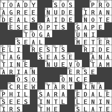 ACROSS 1. Sycophant 6. Distress signal 9. Adept person 12. Match 13. Naked 14. SW Asia republic 15. Allots cards 16. Assistant 17. Brief written record 18. Compass dir. 19. Elects 20. Yawn 21. Ancient Roman robe 23. University (slang) 24. Lick closed 25. Distance measurement 28. Biblical high priest 30. Musical pauses 34. Travel on or in a vehicle 35. Label 36. Gospel singer Marvin 38. Santa ___, CA 39. Prong on a fork 41. New (sp.) 43. Scottish cap 44. Believer in; advocate of (suffix) 46. Celtic language 48. Bear (Spanish) 49. At one time in the past 50. Group working together 51. Small pie 53. _ tizzy (2 wds.) 56. Silvers or Donahue 57. "Two Mules for Sister ____" 58. Peak District village in England 60. Observes 61. International (abbr.) 62. Soviet premier 1918-24 63. Big collection agency 64. Definite Article 65. Schedule DOWN 1. Bit 2. Double curve, resembling the letter S 3. Ancient river in northeast Turkey 4. Keyboard key 5. It is so 6. Set of matching outer garments 7. Likelihood 8. Observe 9. Conciliate 10. Pace 11. Single 13. California wine valley 14. More empty; more void 19. Stares 20. Chewing product 22. Boat paddle 24. Seigniories (variant) 26. Pulitzer Prize-winning author Ferber 27. 480, 500 or 516 sheets of paper 28. Singer James 29. Den 31. Elected rep. 32. The 19th letter of the Greek alphabet 33. Compass dir. 37. Happening 40. Artist's stands 42. The grampus (Milton) 45. Immediately 47. A glass for beer 49. Taken by mouth 50. "Mermaids" star 51. Hyperbolic tangent 52. Johnson of "Laugh-In" 54. Nanny 55. Set down 56. Air pressure measure (abbr.) 57. Be seated 58. Raised railways 59. Compass dir.